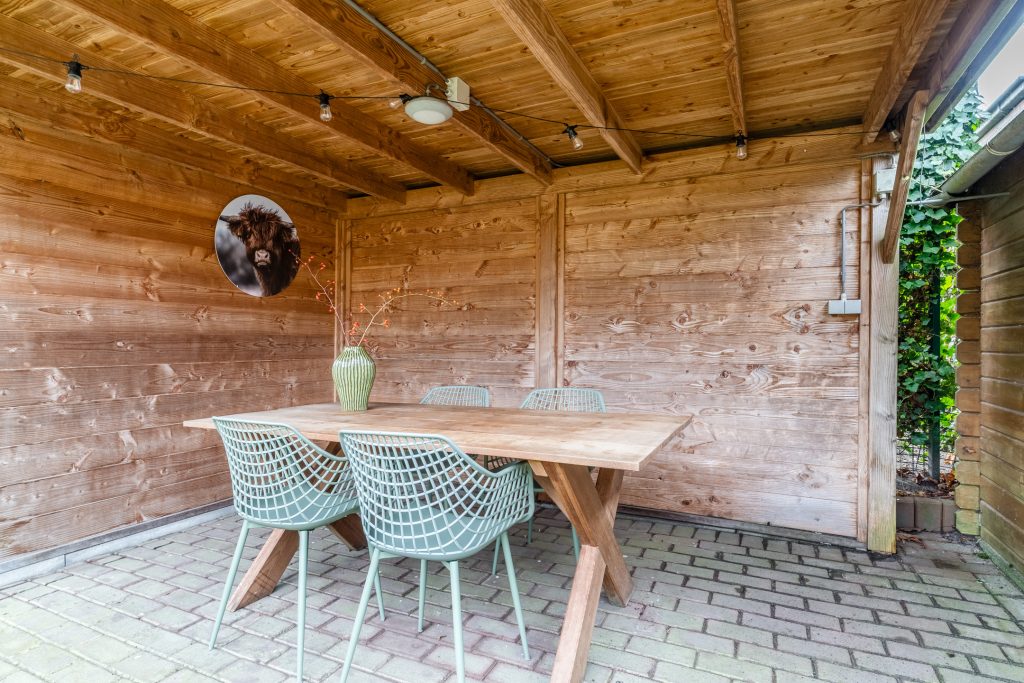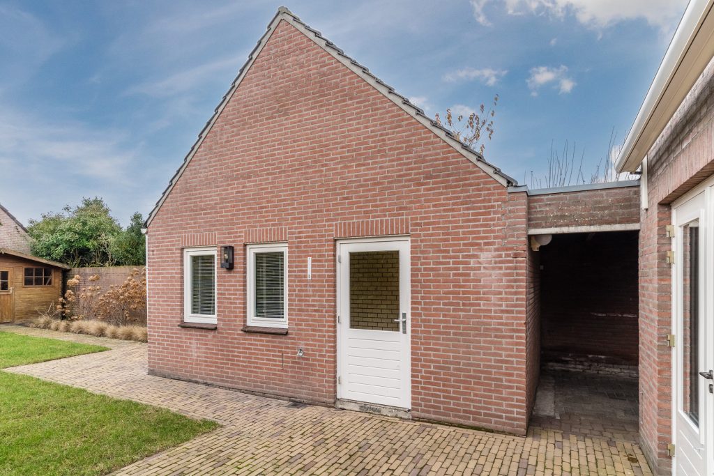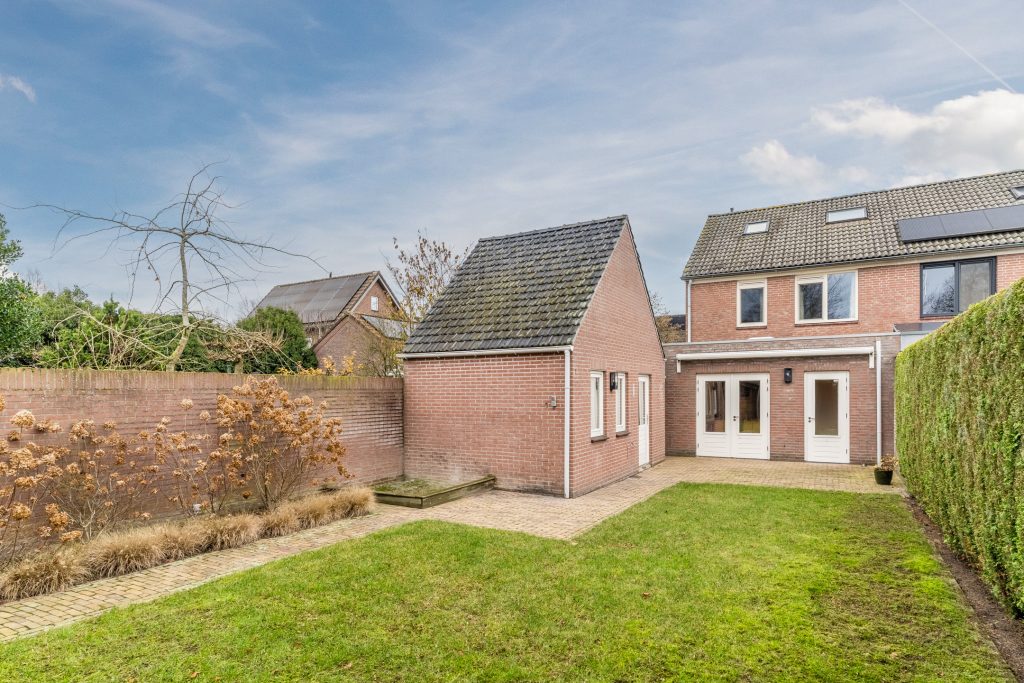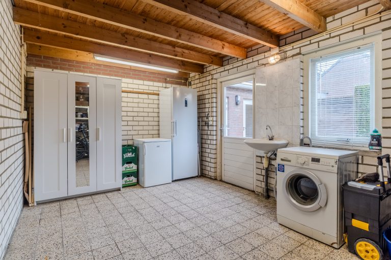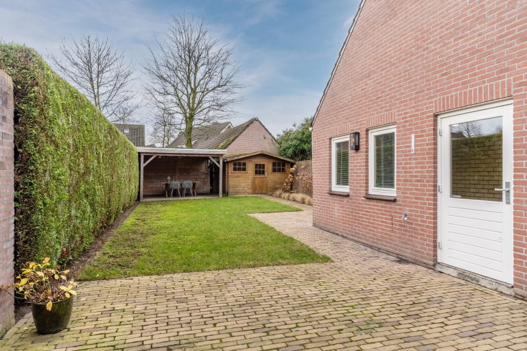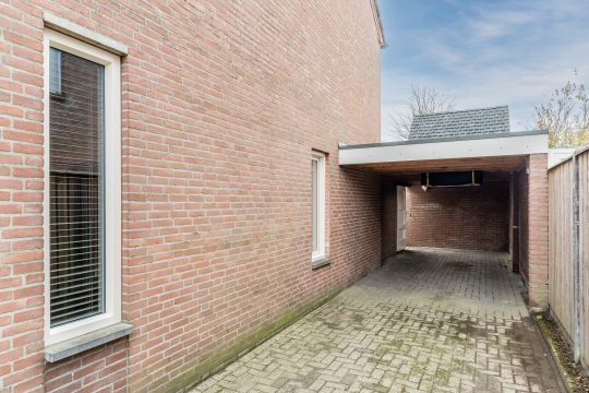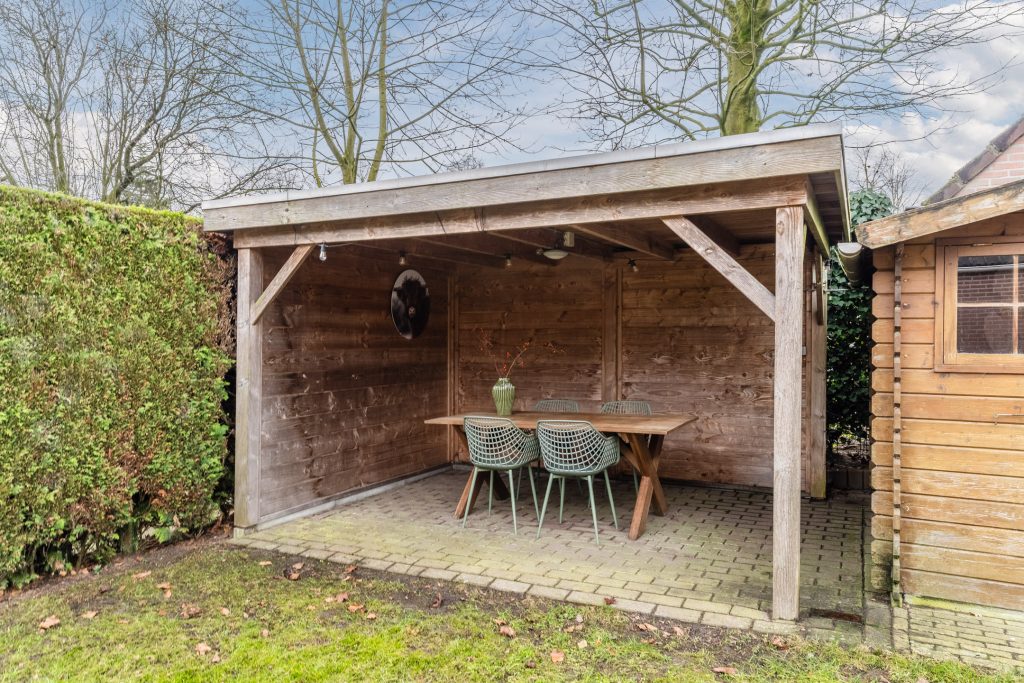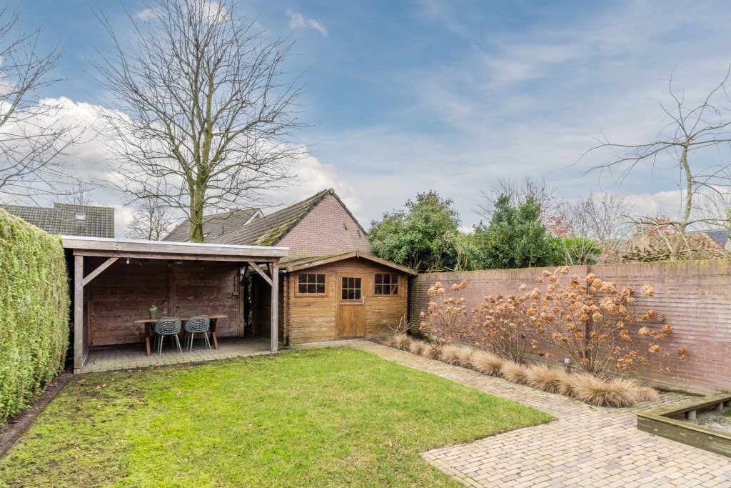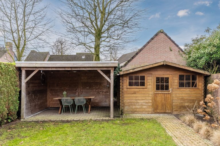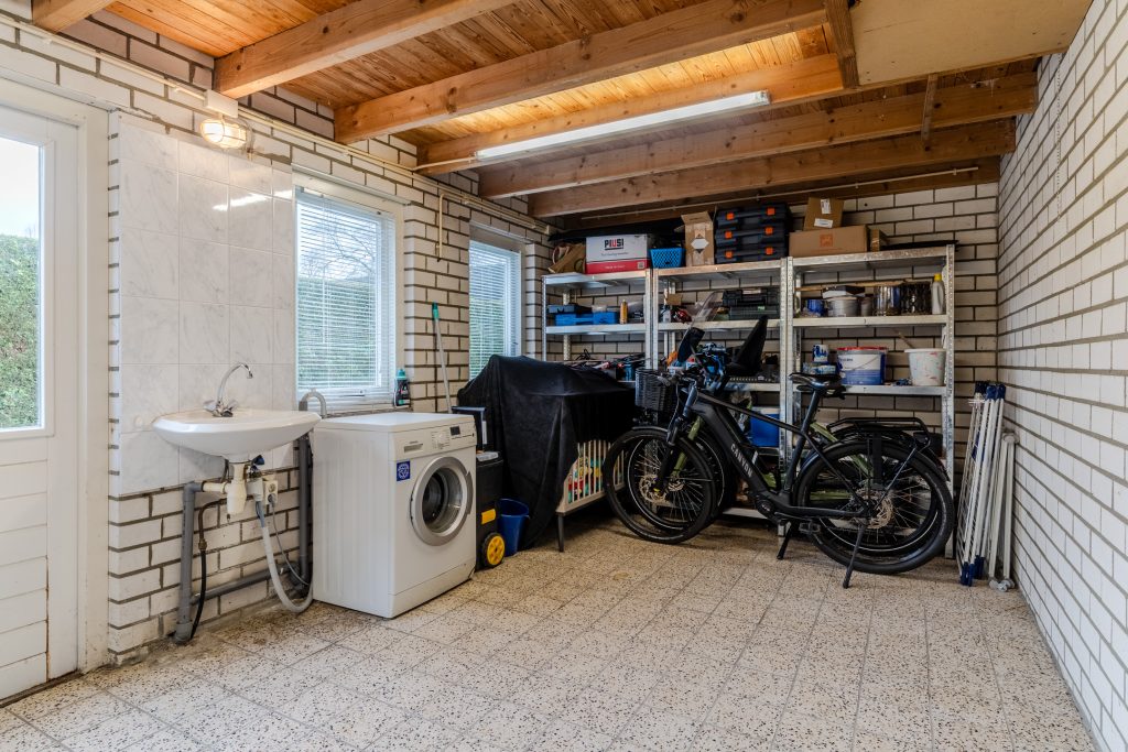 Aansluitend aan de oprit en carport vind je een riante, in spouwmuren gemetselde berging met tegelvloer, wasmachine-aansluiting en een vlizotrap naar een bergzolder. Met het plaatsen van een garagedeur is deze ruimte eenvoudig om te bouwen tot een volwaardige garage. Daarnaast is er nog een houten tuinberging met overkapping, ideaal voor fietsen, tuingereedschap of een gezellige zithoek.