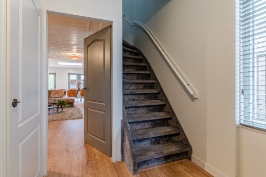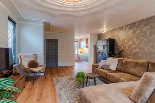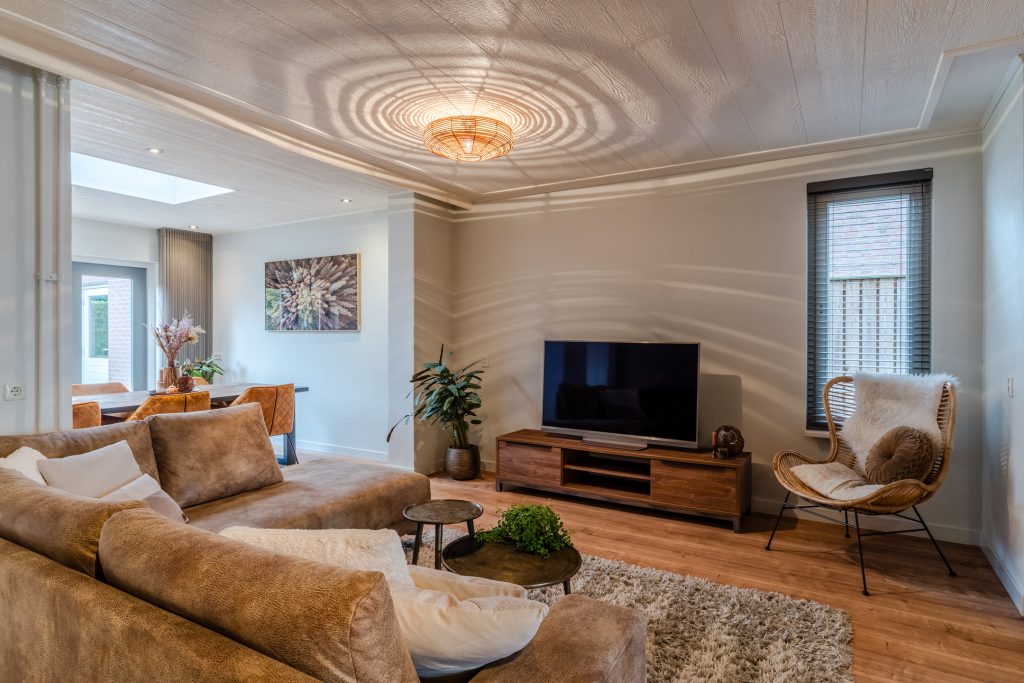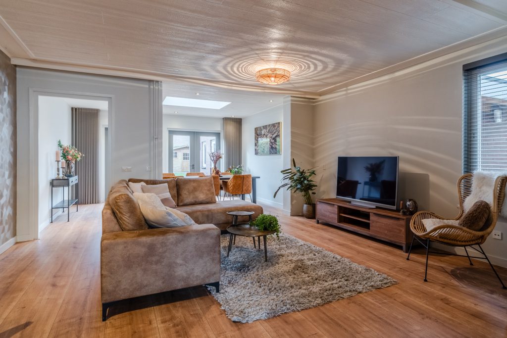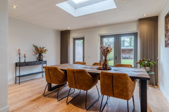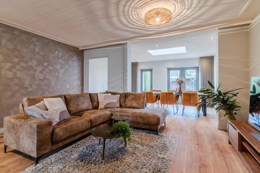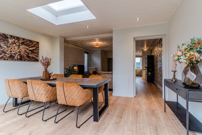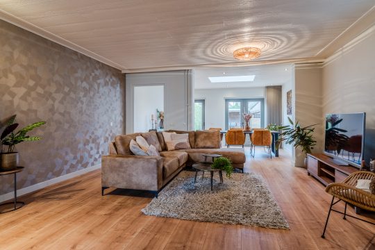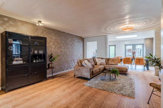De absolute blikvanger is de fors uitgebouwde woonkamer: een zee van ruimte en licht! De combinatie van de lichtkoepel, het grote raamoppervlak en de openslaande tuindeuren (aangevuld met een aparte loopdeur) zorgt voor een fantastische verbinding met de tuin. De woonkamer is sfeervol afgewerkt met een laminaatvloer, stucwerk- en behangwanden en beschikt over een praktische trapkast.
