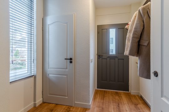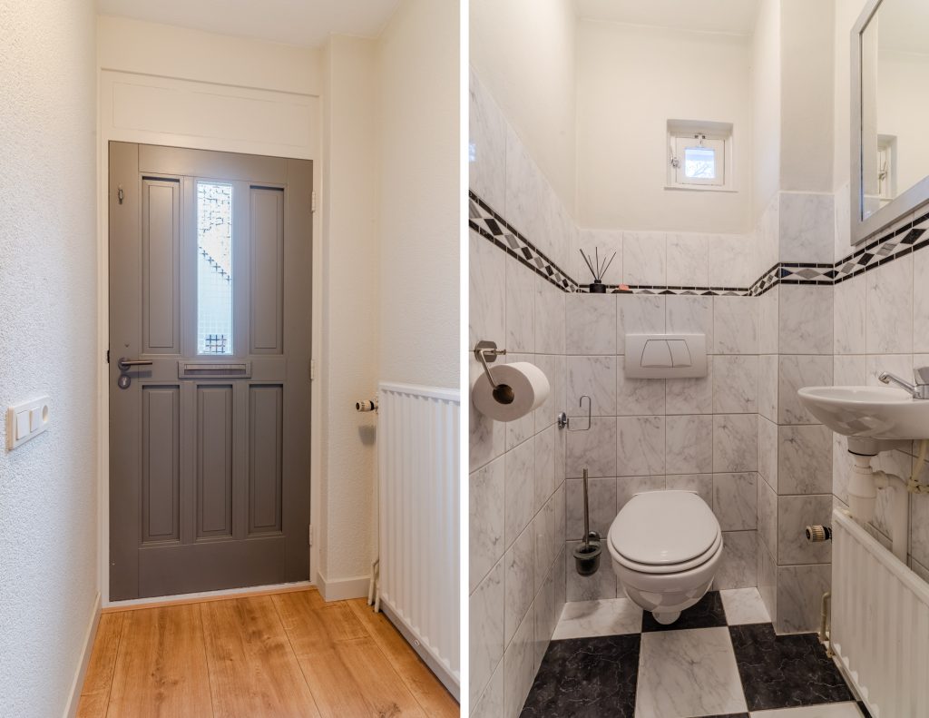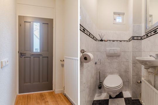 Je betreedt de woning via de verzorgde hal met laminaatvloer, meterkast en een gedeeltelijk betegelde toiletruimte met wandcloset en fonteintje. Vanuit hier heb je toegang tot de woonkamer en de trapopgang naar de eerste verdieping.