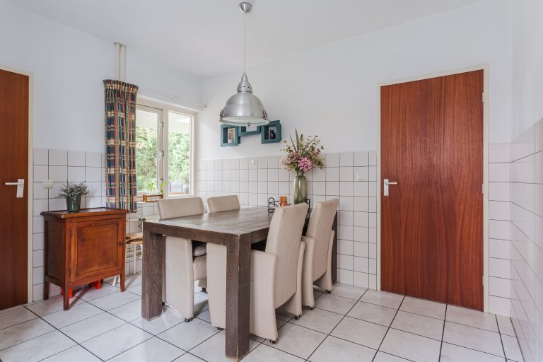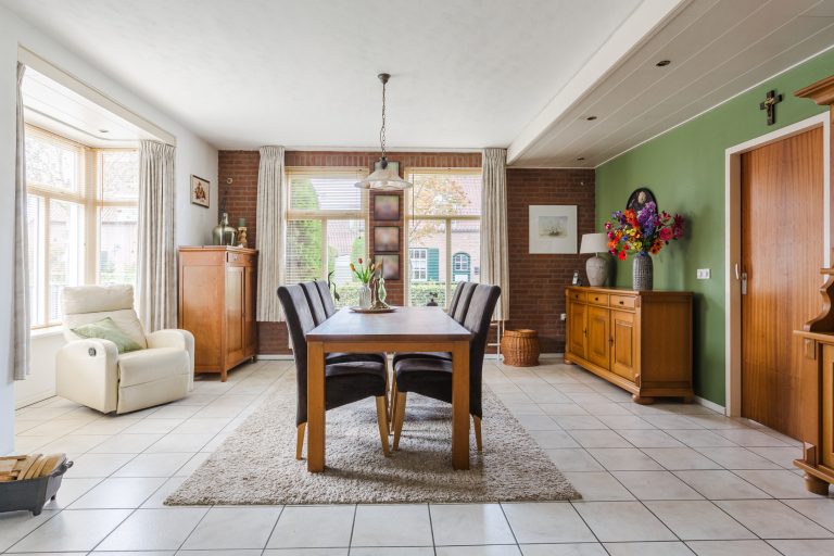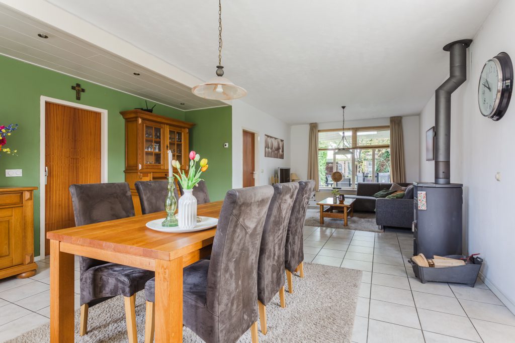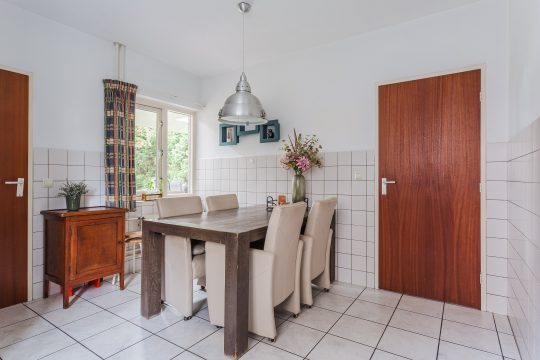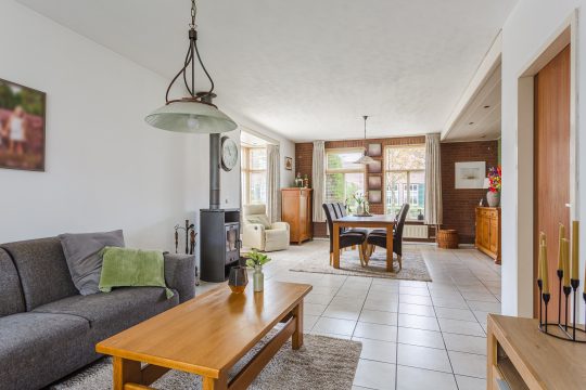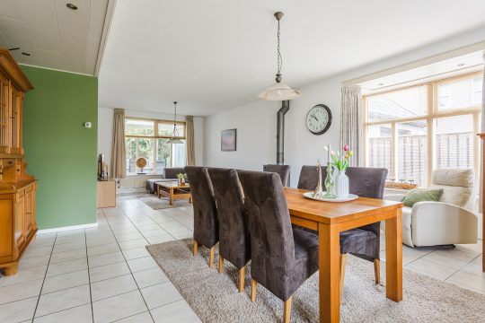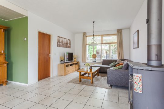 De ruime woonkamer is afgewerkt met een nette tegelvloer met vloerverwarming, stucwerk wanden en stucwerk plafonds. Dankzij de vele ramen en de erker valt er volop daglicht binnen, waardoor de ruimte licht en uitnodigend aanvoelt. Daarnaast beschikt de woonkamer over een gezellige houtkachel. Er is voldoende ruimte voor een grote eettafel waar gemakkelijk 6 personen kunnen plaatsnemen, ideaal om familie of vrienden te ontvangen.