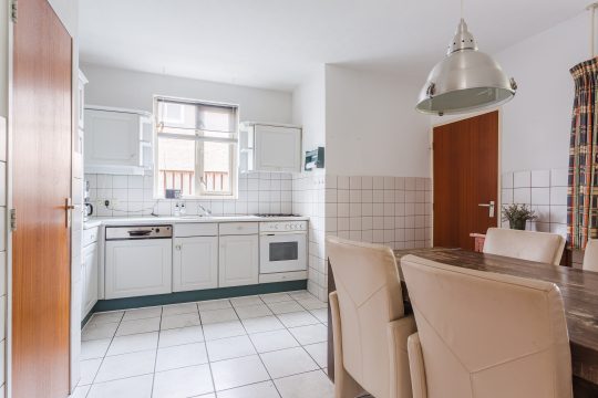 De ruime, dichte keuken is praktisch ingedeeld en uitgerust met een vierpits gasfornuis, koelkast, vaatwasser, oven en afzuigkap. De ruimte is voorzien van vloerverwarming. Aansluitend aan de keuken bevindt zich een royale kelderkast met volop bergruimte voor voorraad, keukengerei of schoonmaakspullen. Dankzij de fijne afmetingen is er bovendien voldoende plek voor een eettafel.