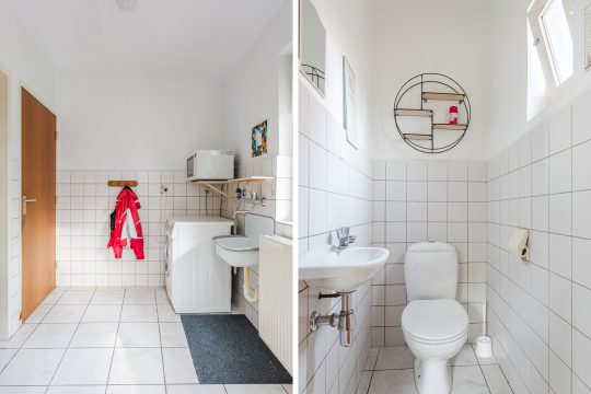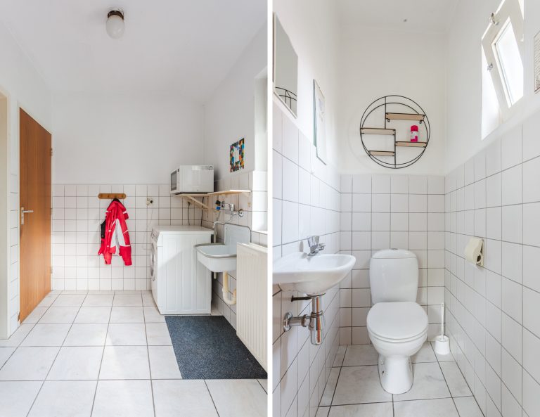 De bijkeuken die verbonden is aan de keuken is voorzien van de witgoedaansluitingen, een gootsteen en een loopdeur naar de tuin. Aan de bijkeuken grenst een apart toilet voorzien van closet en fonteintje.