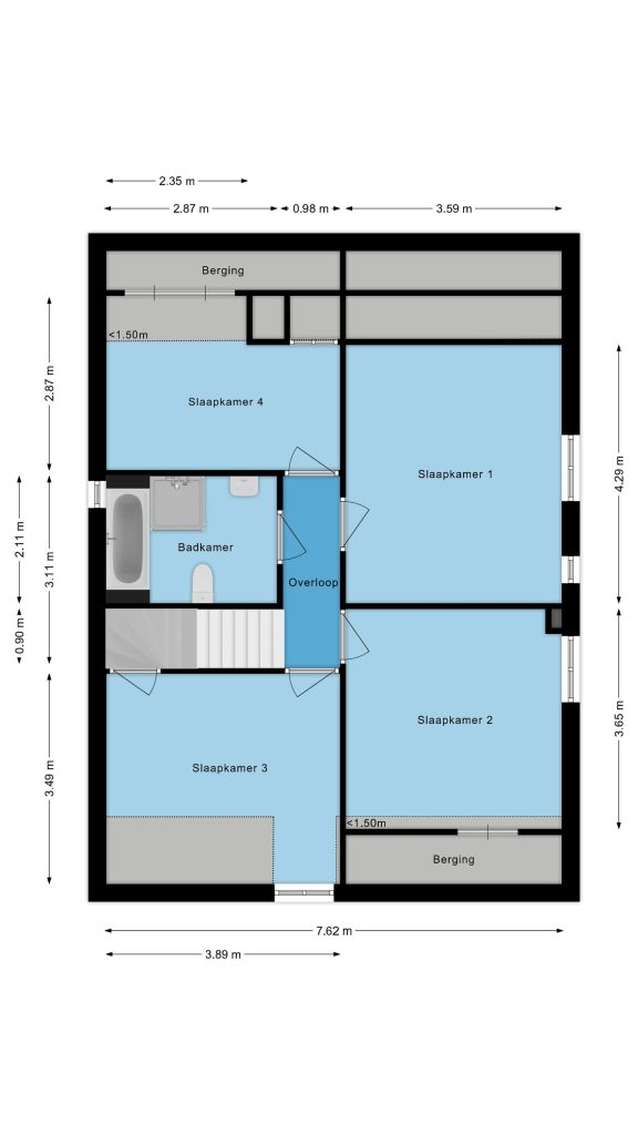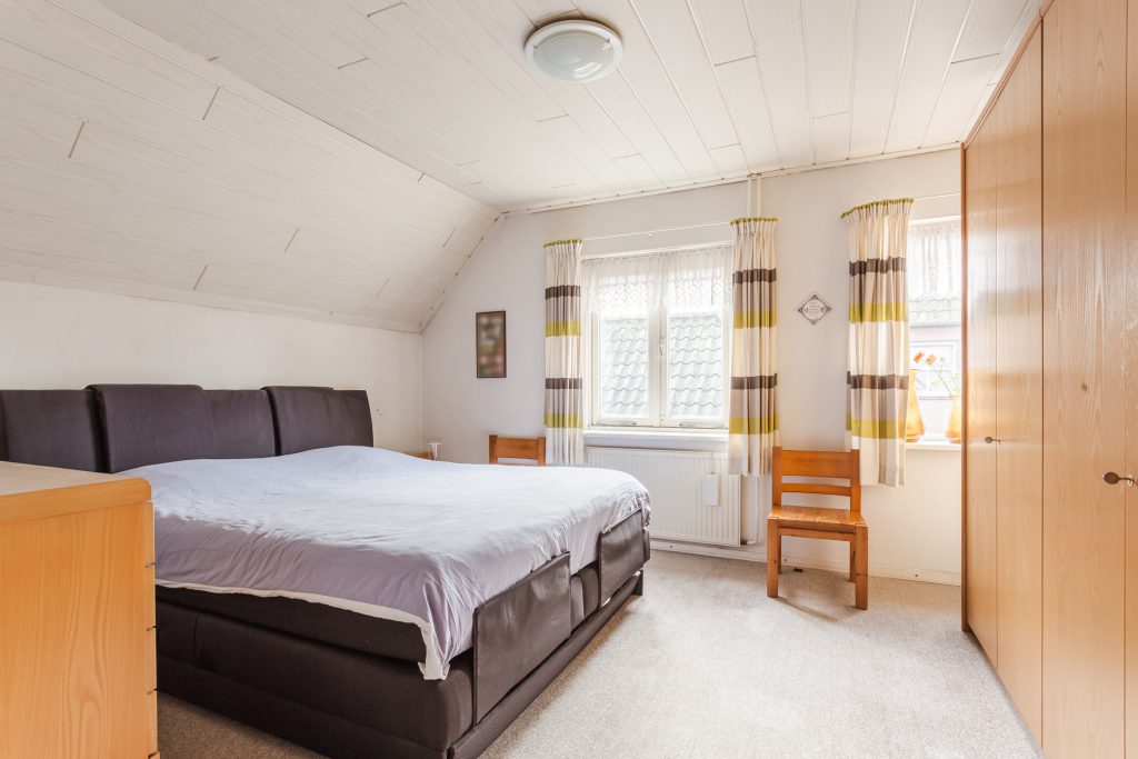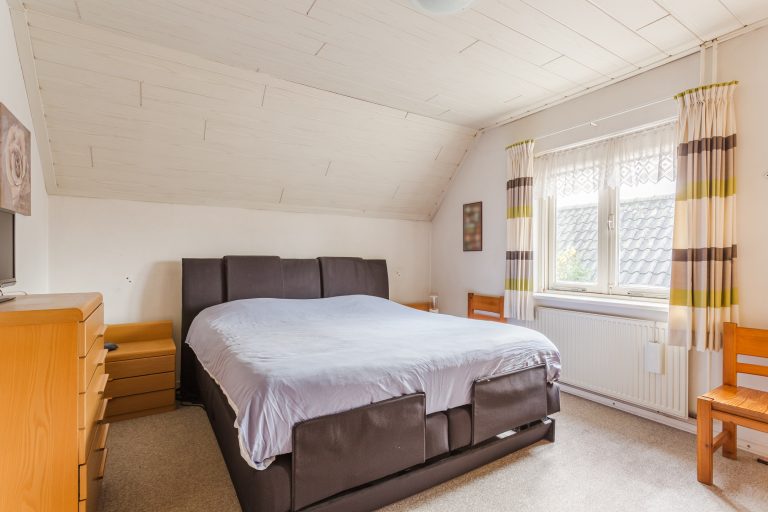 Via de vaste trap in de entree kom je op de eerste verdieping. Vanaf de overloop heb je toegang tot maar liefst vier ruime slaapkamers en de badkamer. De kamers zijn allemaal van een prettig formaat en bieden volop mogelijkheden voor het inrichten van bijvoorbeeld een kinderkamer, werkkamer of hobbyruimte. Twee slaapkamers beschikken bovendien over extra opbergruimte achter de schuine kant. Dankzij de vele raampartijen genieten de slaapkamers van veel natuurlijk licht, wat zorgt voor een prettige en open sfeer. De ruimtes zijn afgewerkt met stucwerk op de wanden en schroten plafonds.