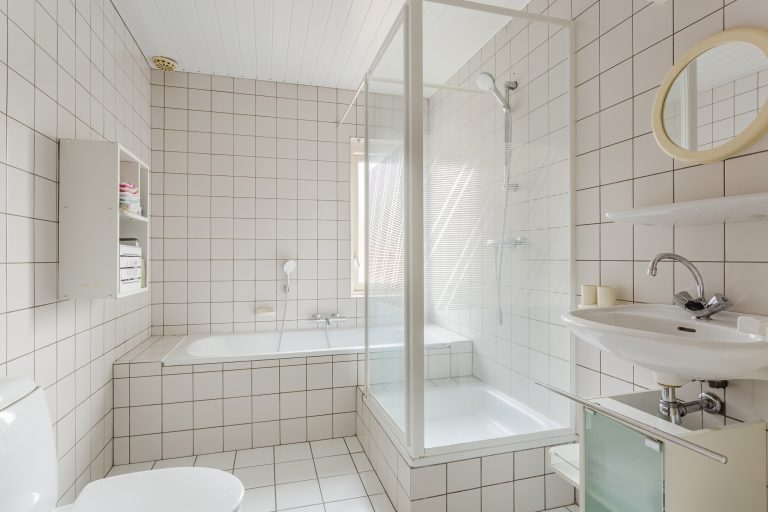 De ruime badkamer is praktisch ingedeeld en voorzien van alle voorzieningen. Zo beschikt de ruimte over een toilet, douche, ligbad, wastafel en radiator. De badkamer is volledig betegeld en uitgevoerd in een neutrale kleurstelling.