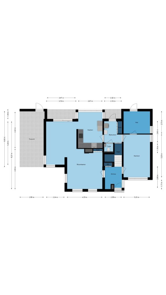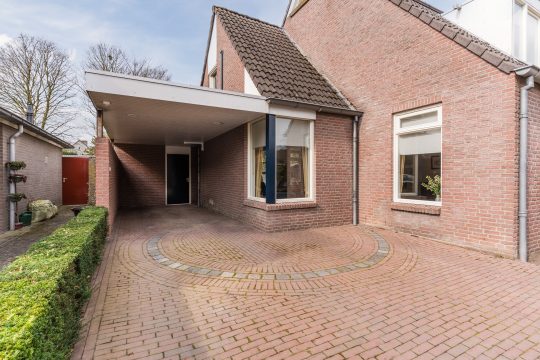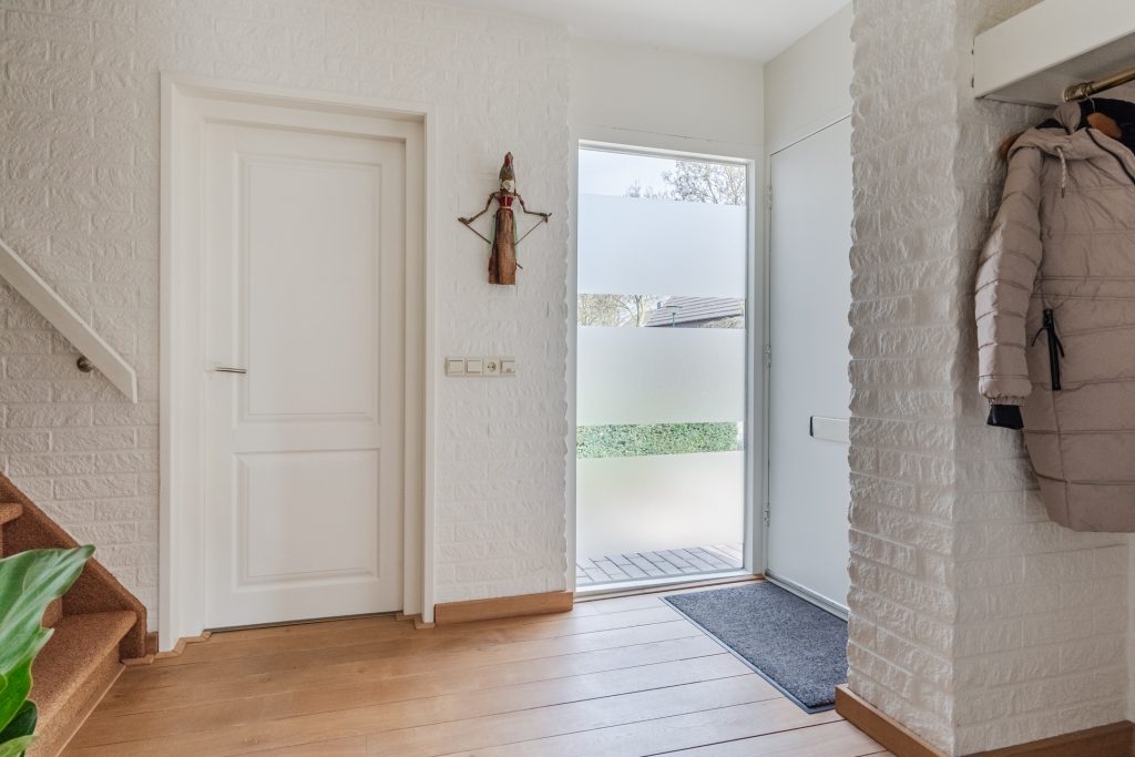 Via de fraai aangelegde voortuin met oprit voor drie auto’s en carport bereik je de entree. De hal is ruim en licht, afgewerkt met een massief eiken vloer. Hier vind je de moderne meterkast uit 2024 met elf groepen, kracht en glasvezel, een garderobe-nis en toegang tot de woonkamer en de extra (speel/kantoor)kamer aan de voorzijde.