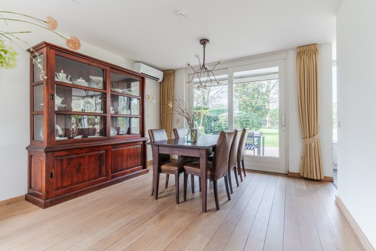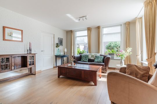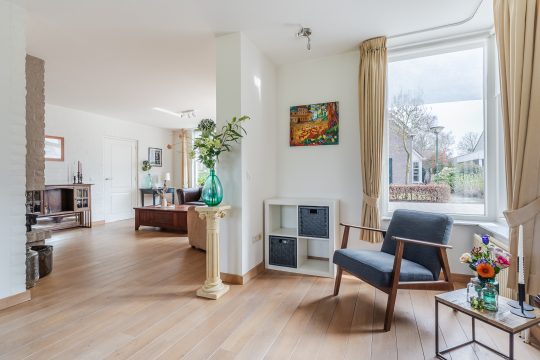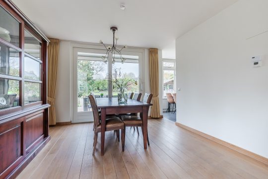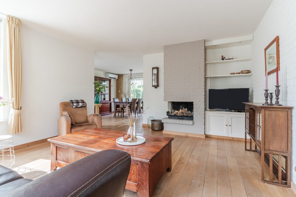 De woonkamer is royaal en baadt in het licht dankzij de vele raampartijen. De massief eiken vloer loopt hier door en geeft warmte aan de ruimte. Aan de voorzijde ligt het zitgedeelte met open haard en uitzicht over de rustige straat. Er is voldoende ruimte voor een extra leeshoek of speelhoek. Aan de achterzijde bevindt zich het ruime eetgedeelte met schuifpui naar de tuin. Elk seizoen biedt hier een ander uitzicht op het groen. De woonkamer is uitgerust met een Mitsubishi airco uit 2024 voor koeling en verwarming.