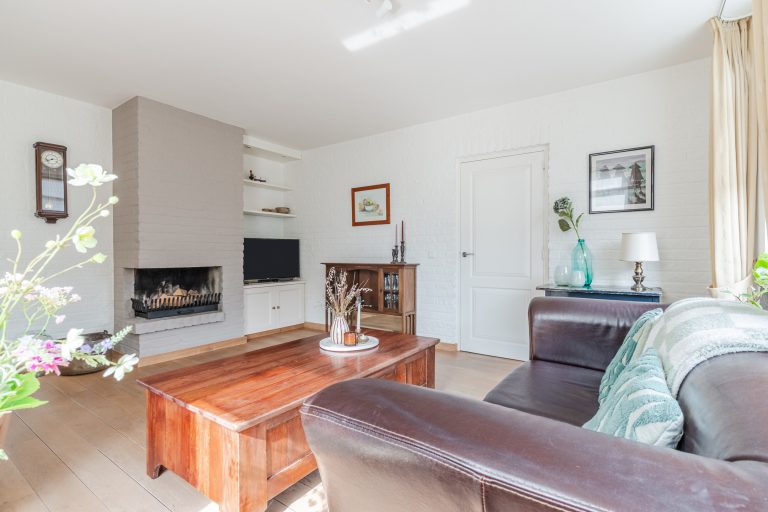 • Riante woonkamer met open haard en schuifpui naar tuin