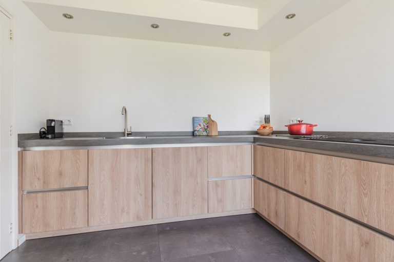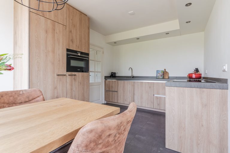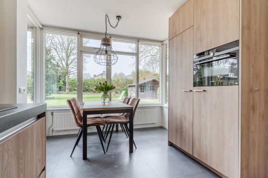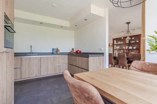De semi open keuken is volledig vernieuwd en uitgevoerd met een maatwerk keuken van Van Diessen Keukens. Het keramisch werkblad, de houtlook fronten en de antraciet PVC tegelvloer zorgen voor een moderne uitstraling. De keuken is voorzien van een Bora inductiekookplaat met geïntegreerde afzuiging, Miele vaatwasser, Siemens combi-oven en een Liebherr XXL koelkast met no frost zones. Inbouwspots zorgen voor goed werklicht. Er is ruimte voor een gezellige eettafel met uitzicht op de tuin.