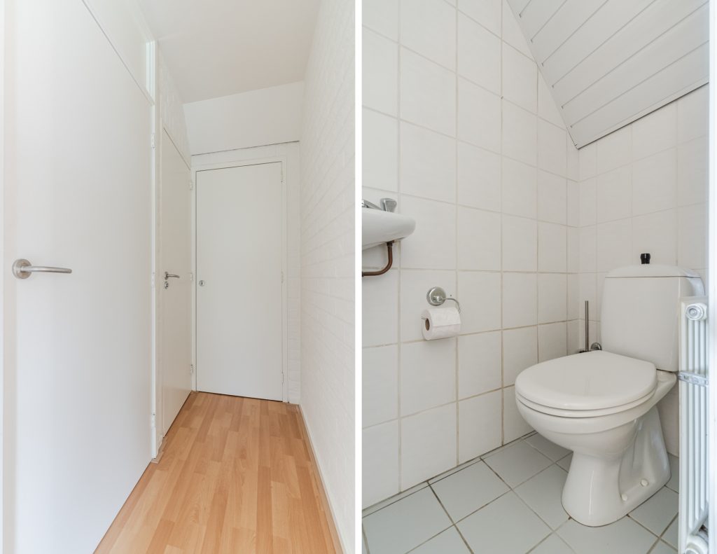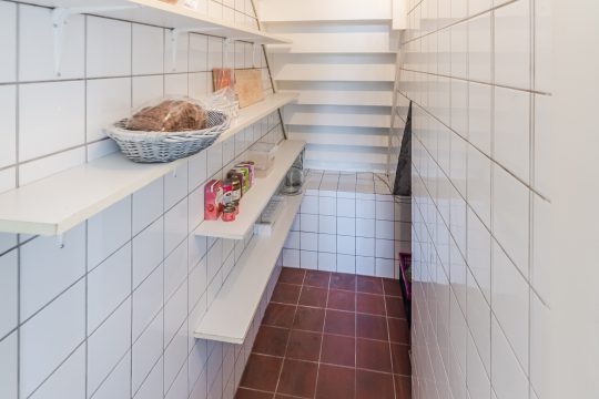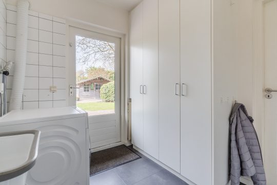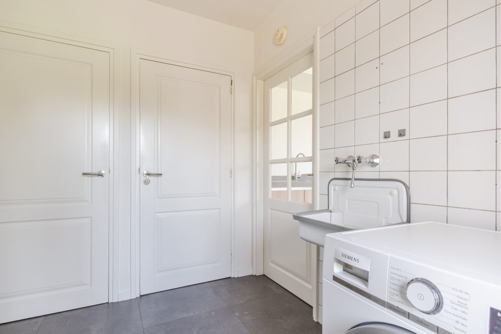 De bijkeuken is praktisch ingericht met uitstortgootsteen, witgoedaansluitingen, vaste kastenwand en een zeer ruime verdiepte kelder. Hier bevindt zich ook een moderne toiletruimte met hangcloset en fonteintje.