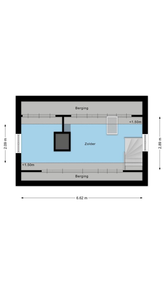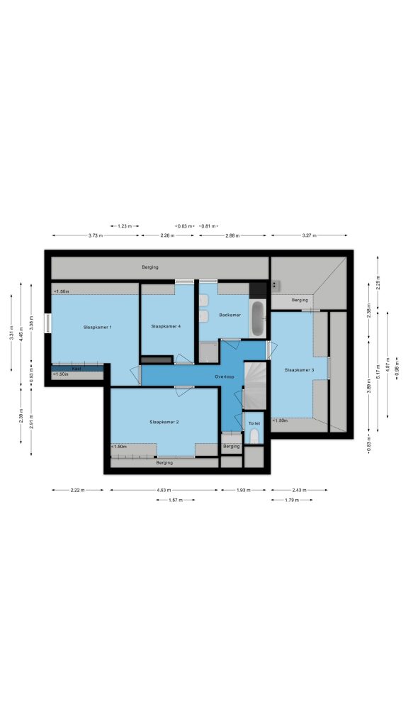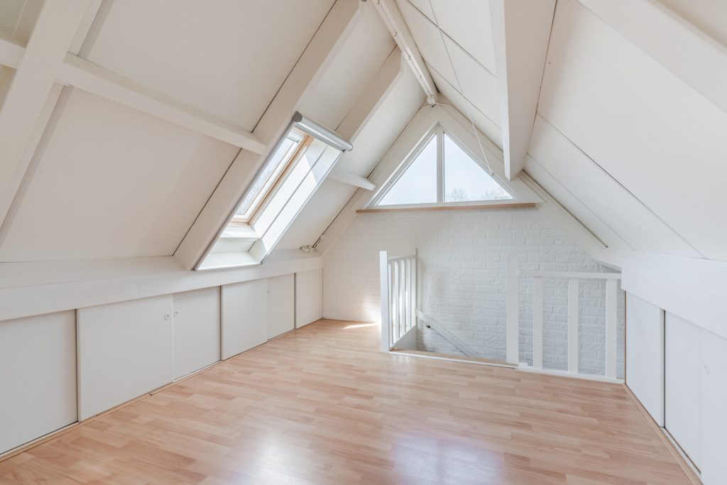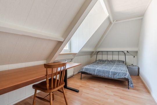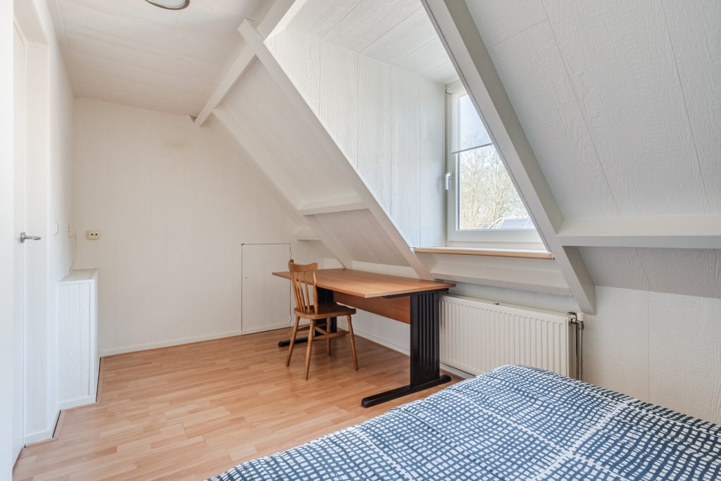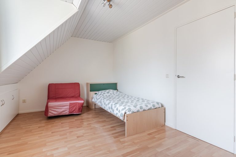 Via de vaste trap bereik je de tweede verdieping met betonnen verdiepingsvloer. Deze ruimte biedt volop mogelijkheden voor een vijfde slaapkamer of hobbyruimte. Er is een Velux dakraam aanwezig en bergruimte onder de schuine kanten.