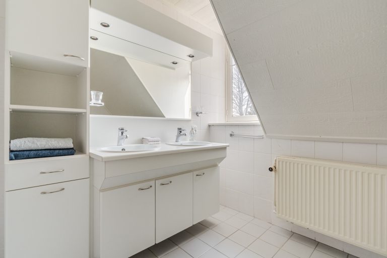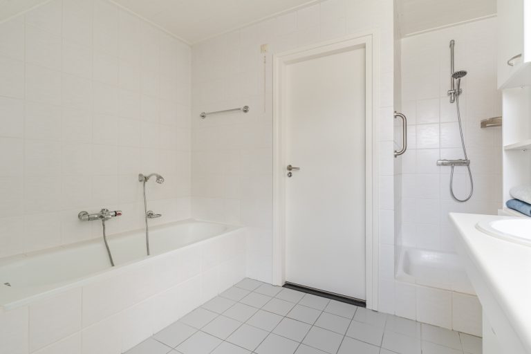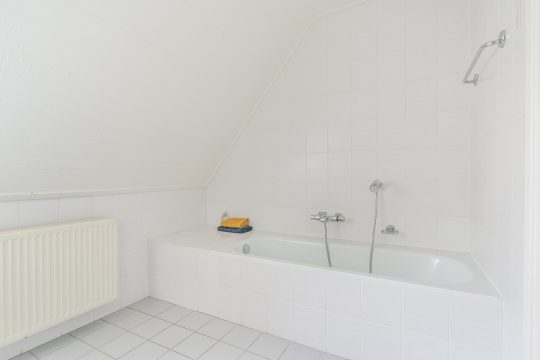 De badkamer is ruim en volledig betegeld. Je vindt hier een ligbad, douche, dubbel wastafelmeubel, dakkapel en radiator.