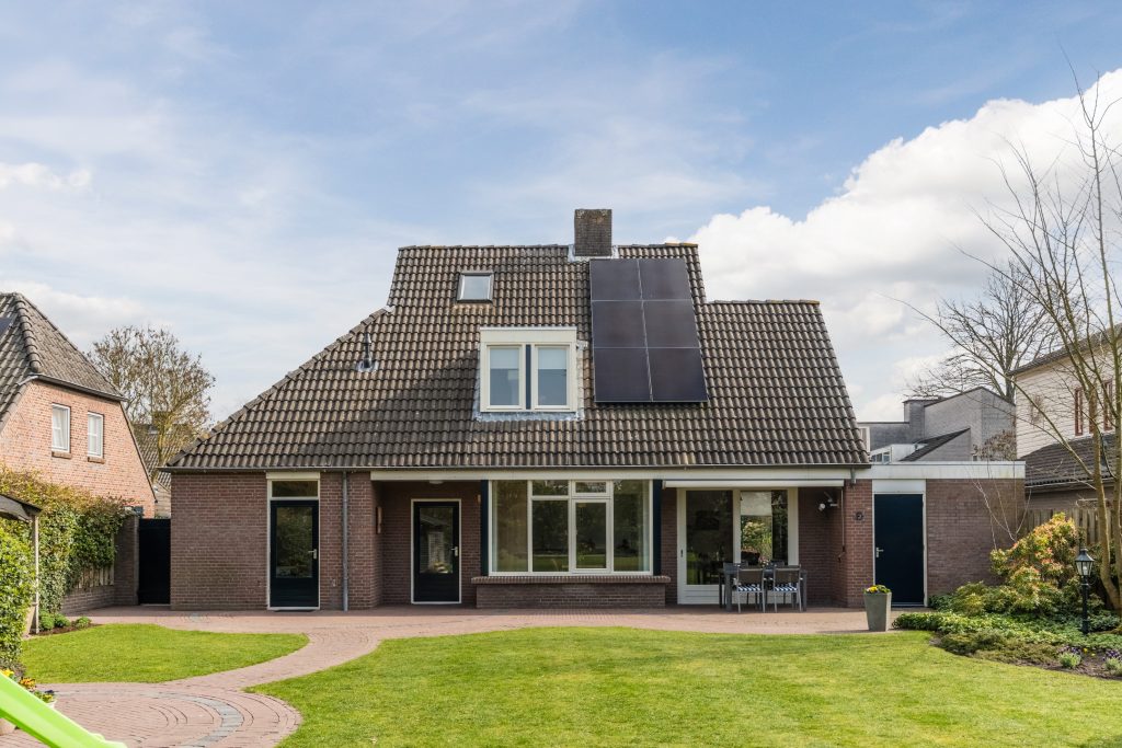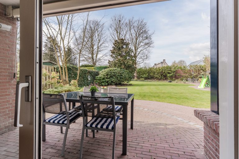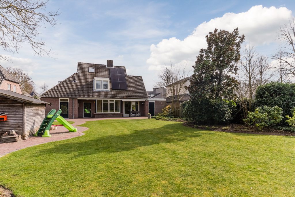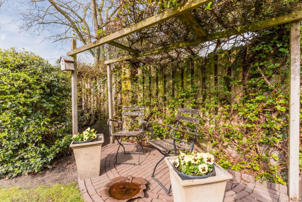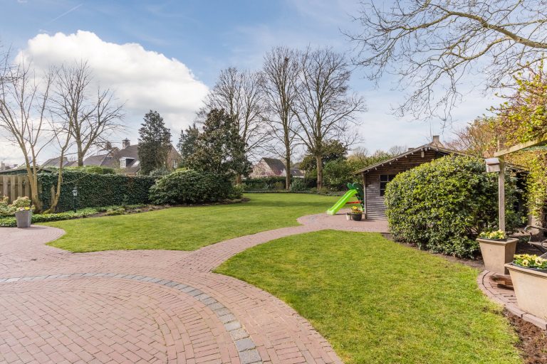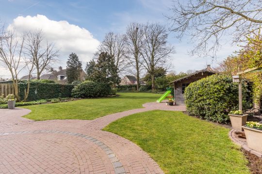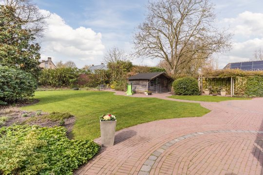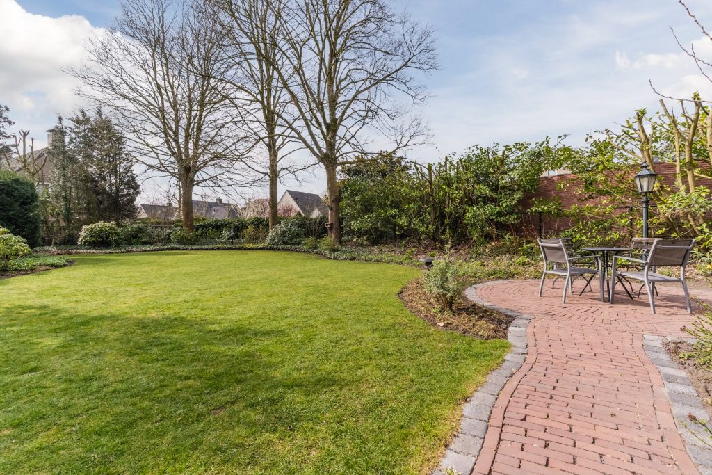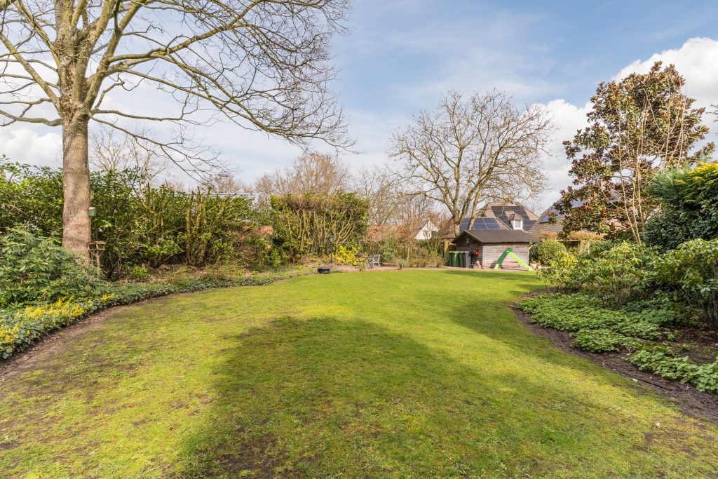 De achtertuin is een waar paradijs. Gelegen op het zuidwesten geniet je hier de hele dag van zon, rust en privacy. Het perceel van 1.007 m² is parkachtig aangelegd met strak gazon, volwassen bomen en vaste beplanting. De robotmaaier zorgt voor gemak. De tuin is voorzien van een grondwaterpomp met beregeningsinstallatie en pop up sproeiers. Direct aan de woning ligt een royaal zonneterras met zonneluifel. Aan de achterzijde van het perceel bevindt zich een tweede terras. De speelse half ronde bestrating geeft de tuin karakter. Er zijn diverse buitenverlichtingspunten, elektrapunten en aan beide zijden een eigen achterom. Het tuinhuis is voorzien van elektra en herbergt onder andere de grondwaterpomp.