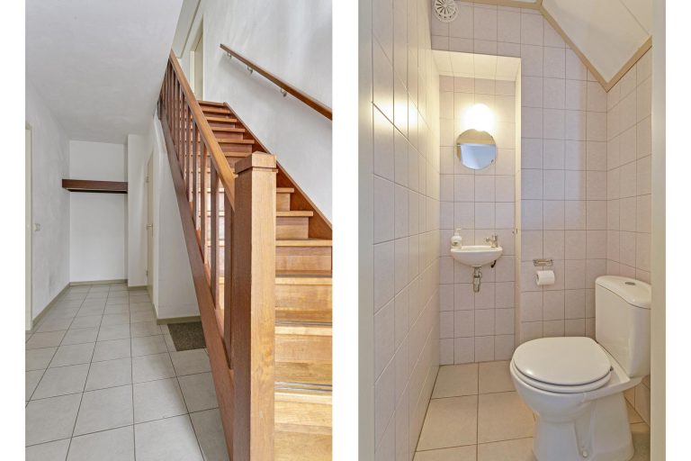 Entreehal met tegelvloer, volledig betegelde toiletruimte met wandcloset en fonteintje, garderobenis, meterkast (met 6 groepen, 2 aardlekschakelaars en glasvezelaansluiting), toegang tot de woonkamer en slaapkamer, alsmede een hardhouten trapopgang naar de 1e verdieping.