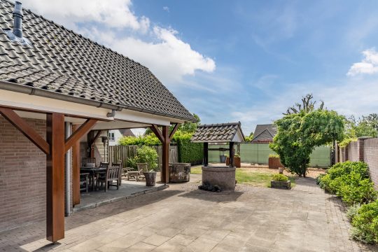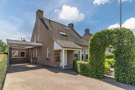 De woning beschikt over een smaakvol aangelegde voortuin met diverse beplanting en een brede oprit die, samen met de carport, plaats biedt aan meerdere auto’s.