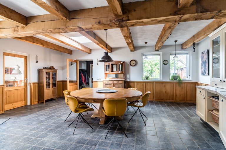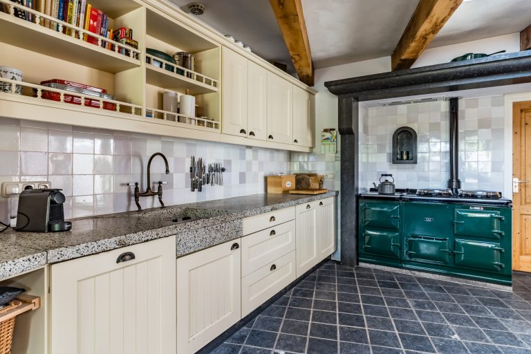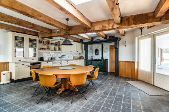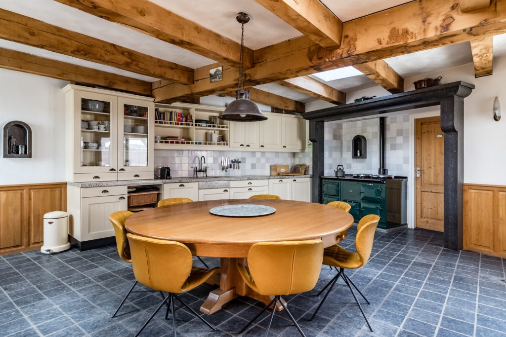De riante leefkeuken vormt het hart van het huis. Dankzij twee lichtkoepels en openslaande deuren naar de tuin is het een heerlijk lichte plek waar gezin en vrienden graag samenkomen. De landelijke keukenopstelling beschikt over een terrazzo werkblad, een hardstenen schouw met afzuigkap en diverse inbouwapparatuur, waaronder een koelkast en vaatwasser.