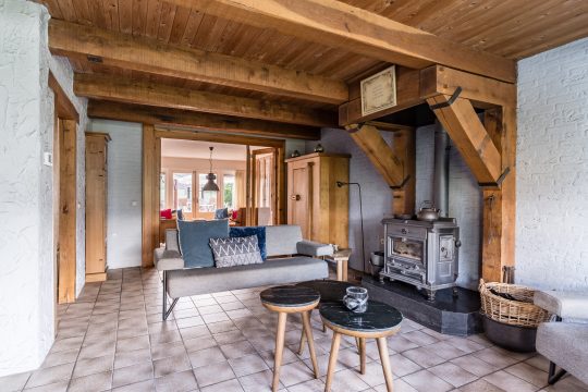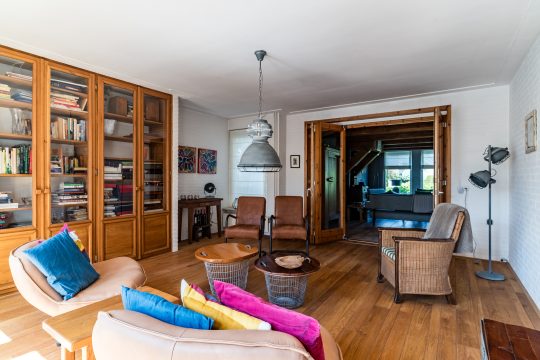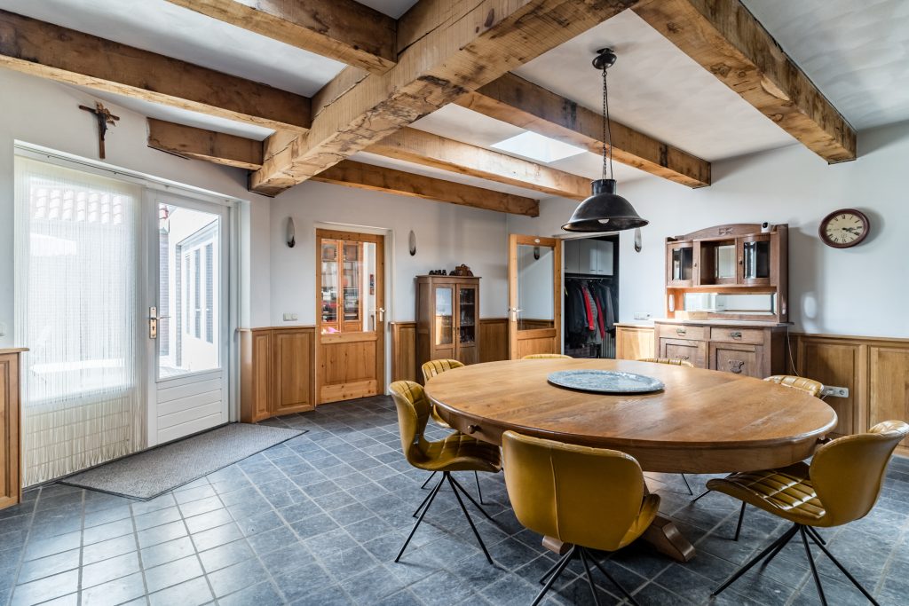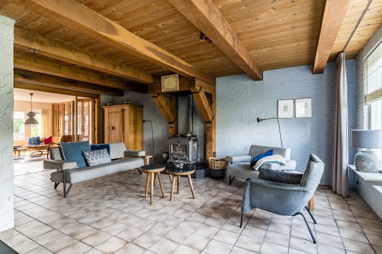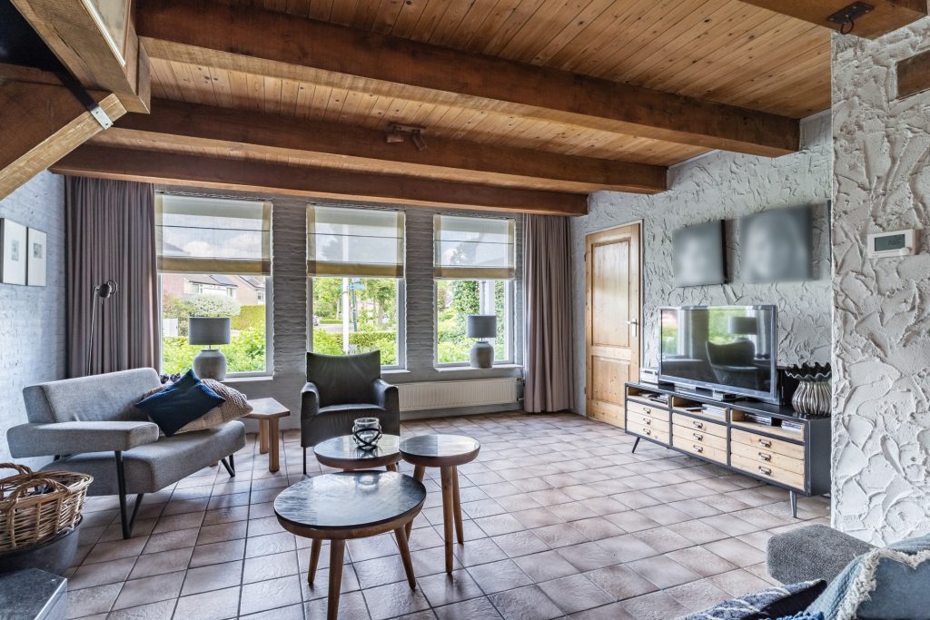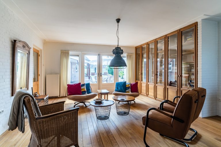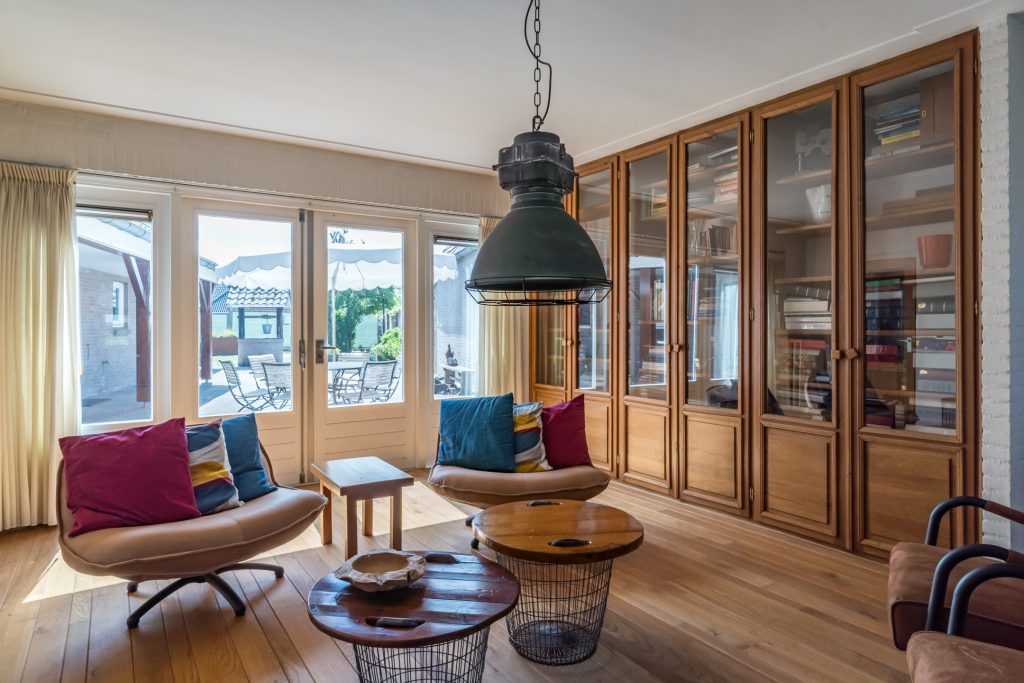 De royale woonkamer vormt een sfeervolle leefruimte met een tegelvloer, grof gestucte wanden, schoonmetselwerk en een robuust balkenplafond. Door de grote ramen aan de voorzijde geniet je van een vrij uitzicht over de brede straat. Via een brede harmonicadeur is de tuinkamer bereikbaar. Deze lichte en gezellige ruimte, voorzien van een eikenhouten vloer, lichte schoonmetselwerkwanden en een stucwerkplafond met sierlijst, heeft openslaande deuren die toegang geven tot de zonnige achtertuin.