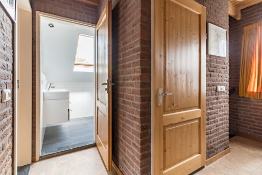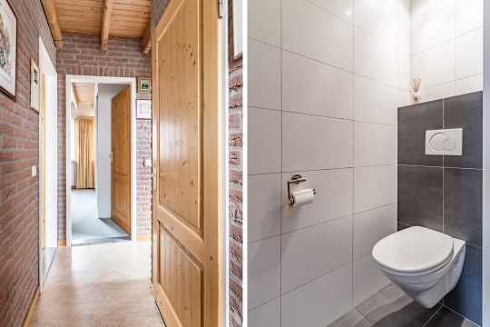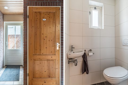 Grenzend aan de woonkamer bevindt zich een fijne kantoor- of speelkamer. Deze ruimte heeft een tegelvloer, grof gestucte wanden en een sfeervol kraaldelen plafond, waardoor hij zich uitstekend leent als werkplek, speelkamer of bibliotheek. Vanuit het portaal, dat eveneens op de begane grond ligt, zijn de carport en het modern uitgevoerde toilet bereikbaar. Het toilet is volledig betegeld en voorzien van een wandcloset en fonteintje.