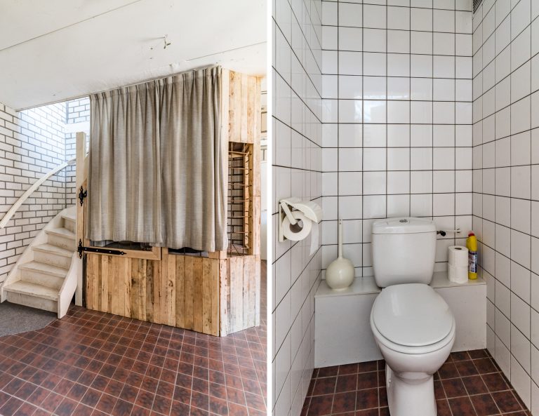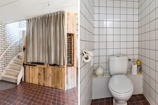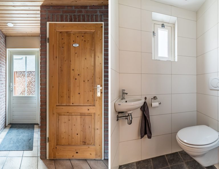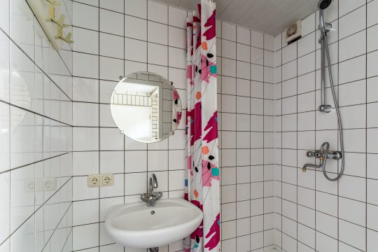 Achter in de woning ligt nog een tweede portaal met toegang tot het souterrain en een extra badkamer, volledig betegeld en uitgerust met een douche en wastafel.