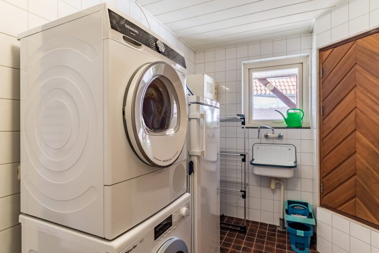 Aansluitend bevindt zich de volledig betegelde bijkeuken, voorzien van een uitstortgootsteen, wasmachineaansluiting en toegang tot het souterrain.