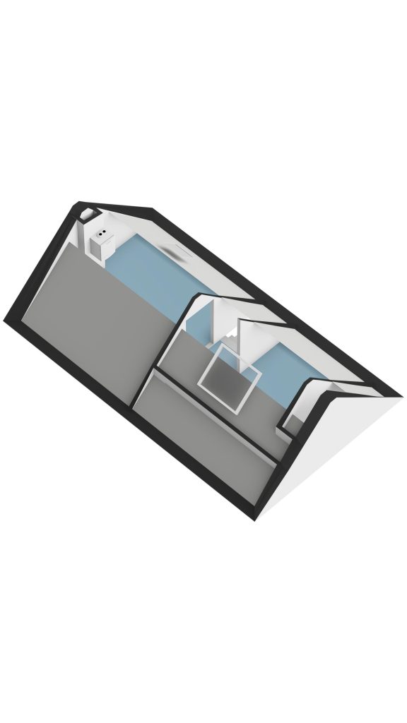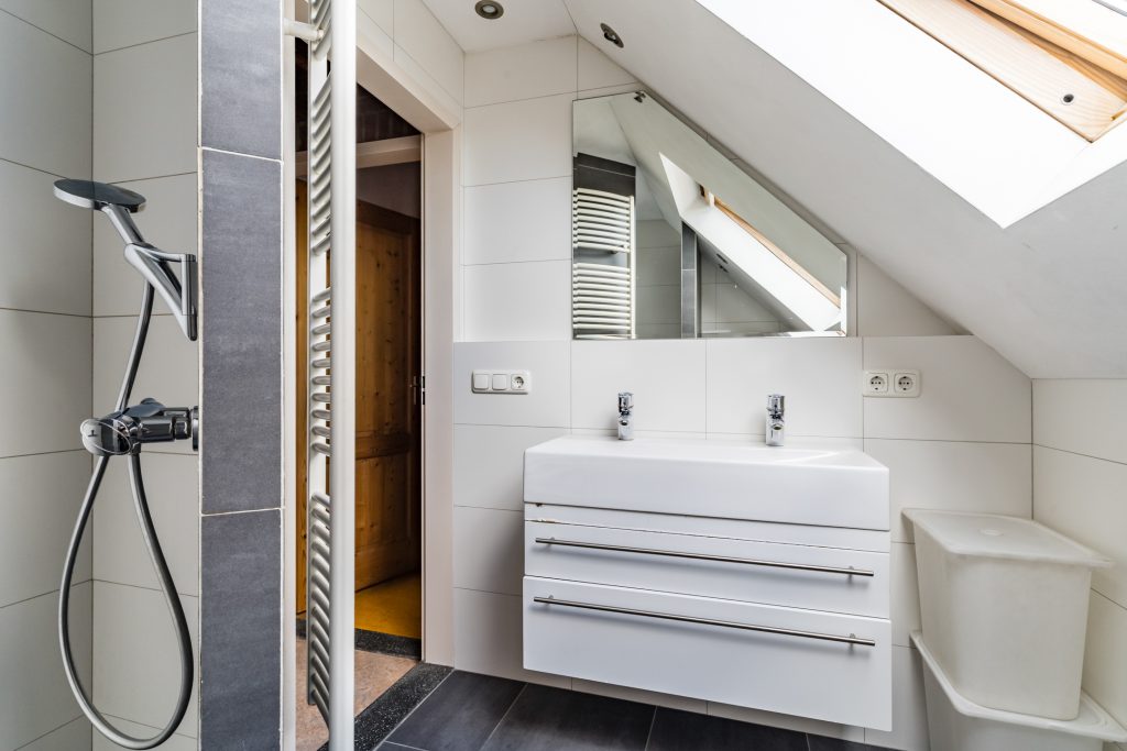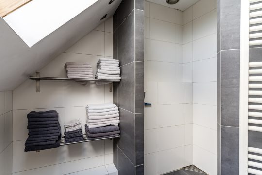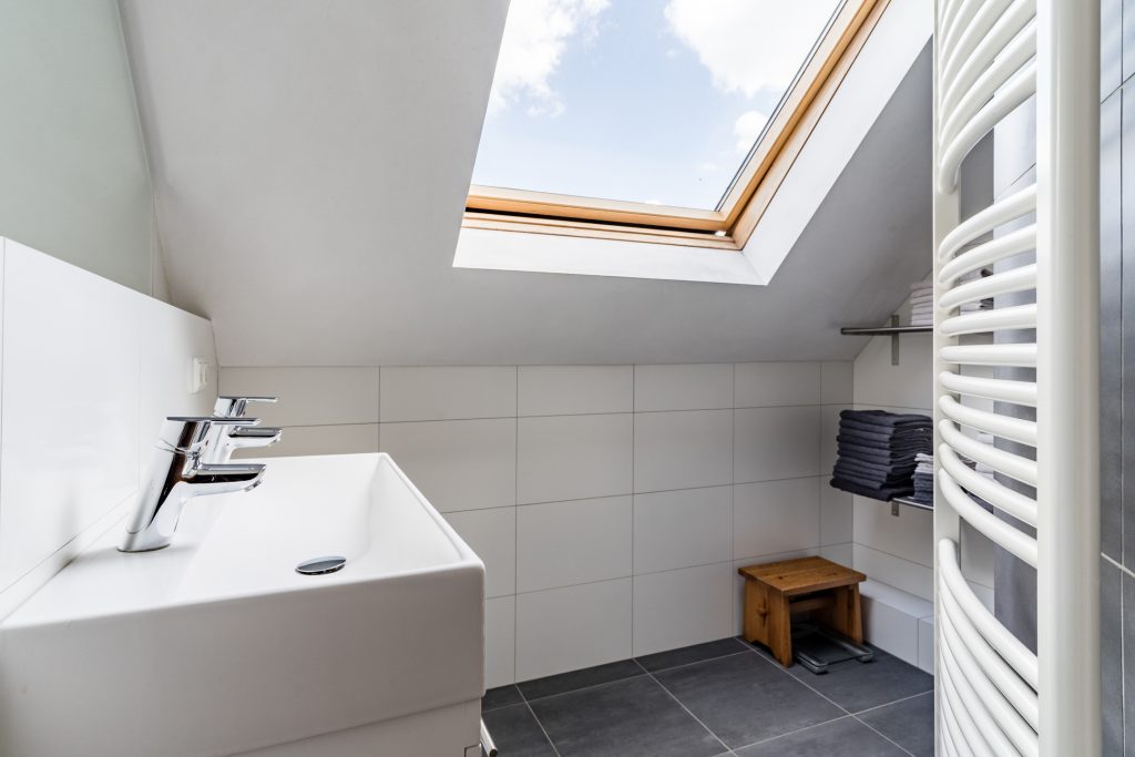 De badkamer is volledig betegeld en uitgerust met een ruime inloopdouche, een modern wastafelmeubel, een designradiator en een Velux dakvenster dat zorgt voor daglicht en natuurlijke ventilatie.