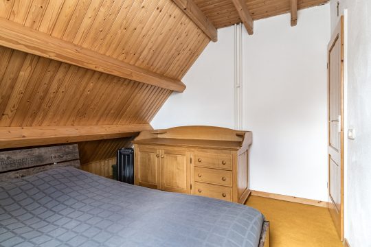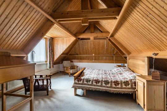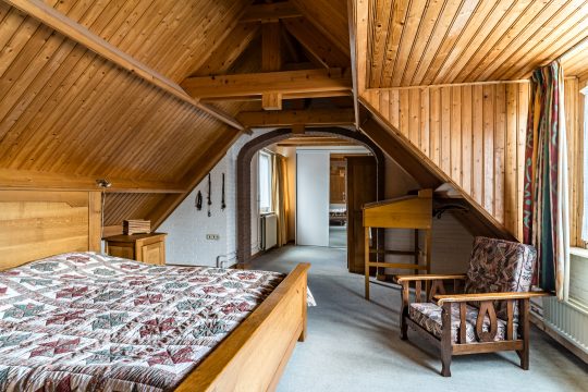 De zeer royale masterbedroom heeft een sfeervol balkenplafond met kraaldelen, een dakkapel, vloerbedekking en een vaste kastenwand. Vanuit deze kamer leidt een vaste trap naar de tweede verdieping, waarbij de trapopgang desgewenst kan worden afgescheiden om de doorgang via de slaapkamer te voorkomen.