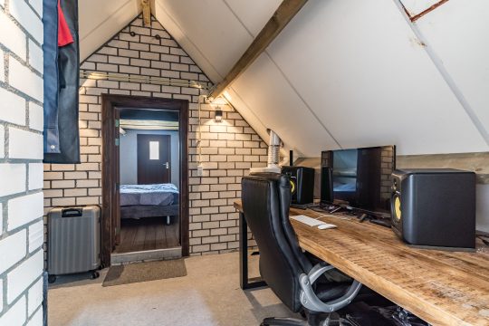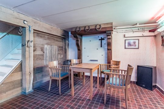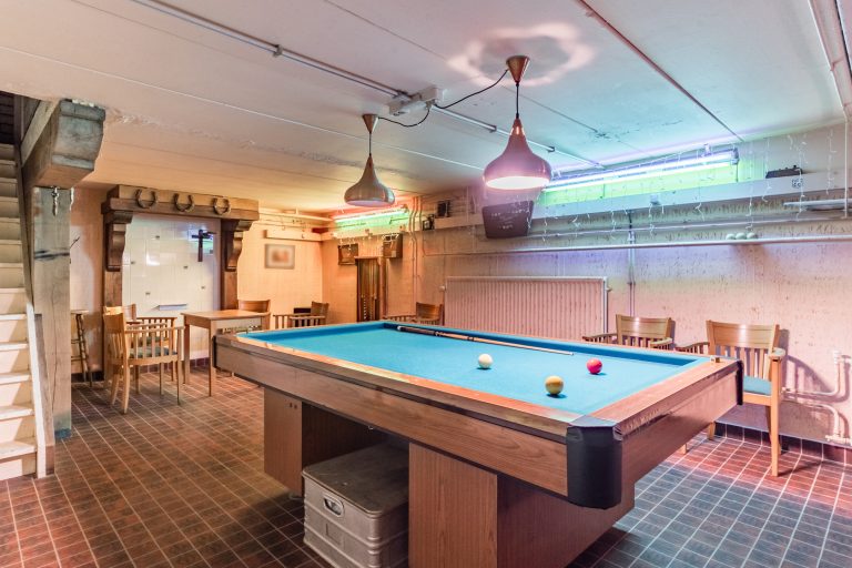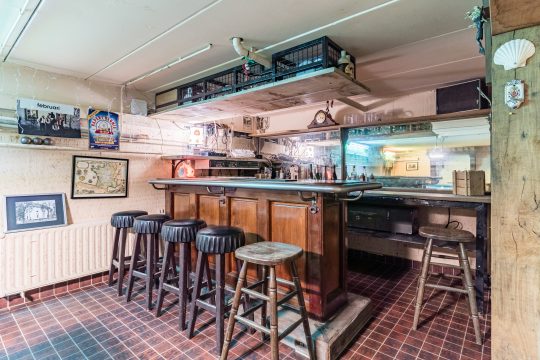 Het indrukwekkende souterrain onder de aanbouw is een van de grootste verrassingen van de woning. Met een afmeting van bijna 10 bij 4,5 meter is het momenteel ingericht als gezellige mancave met een bar, biljart en twee voormalige bedstedes als trapkasten. Dankzij de ruime opzet en goede toegankelijkheid leent deze verdieping zich ook uitstekend voor hobby’s, een thuisbioscoop, fitnessruimte of praktijk aan huis.