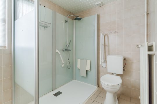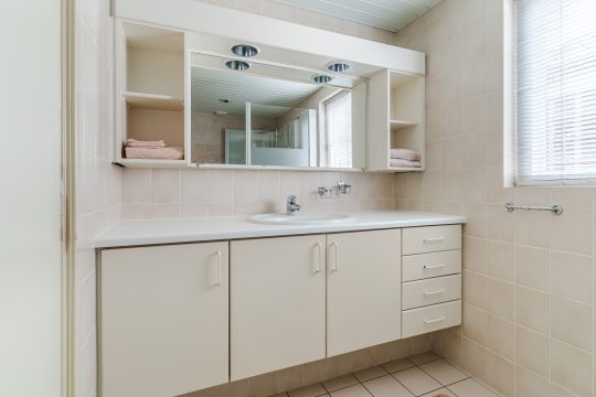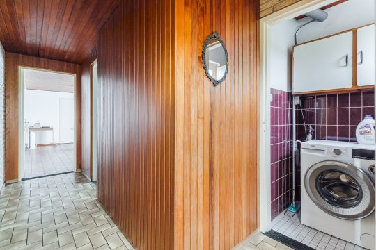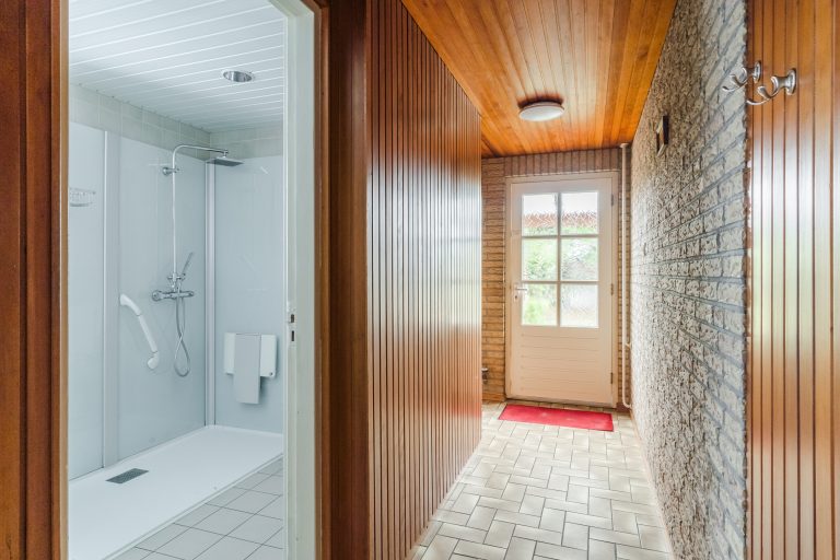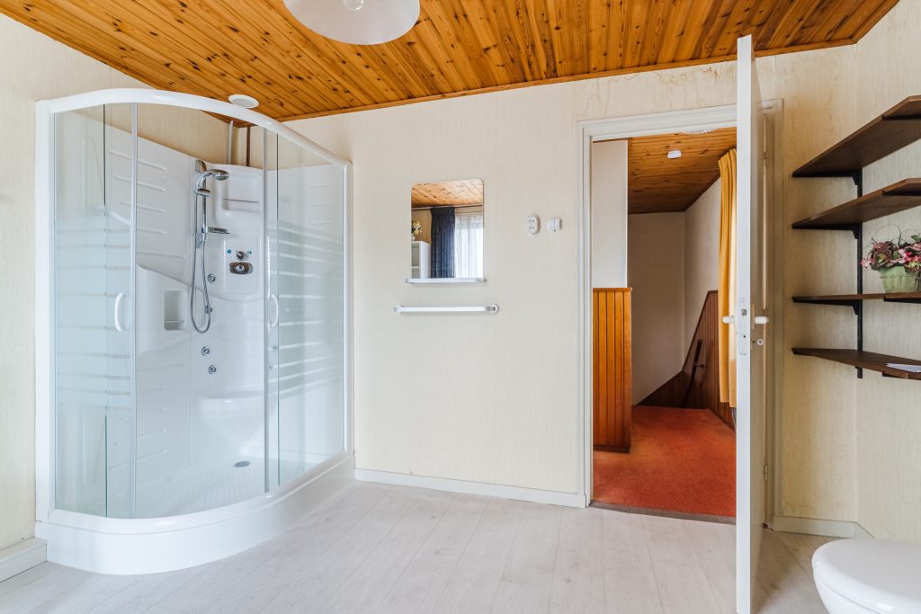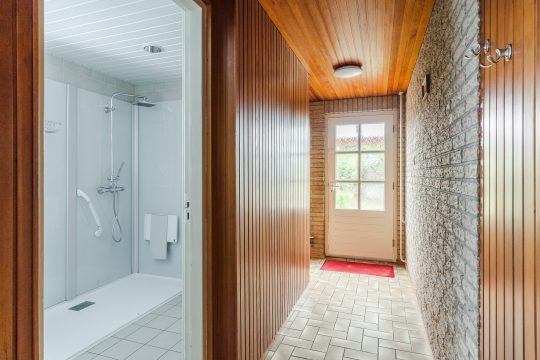 Via de achtergelegen gang bereik je de achtertuin, de wasruimte, en de volledig betegelde badkamer. Deze badkamer is voorzien van een ruime douche, toilet en modern wastafelmeubel.