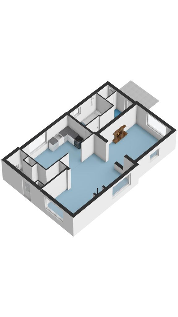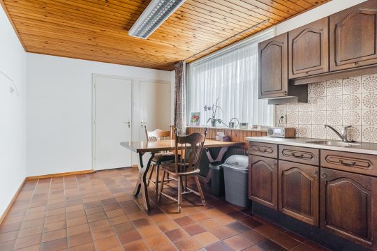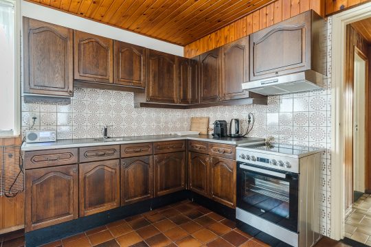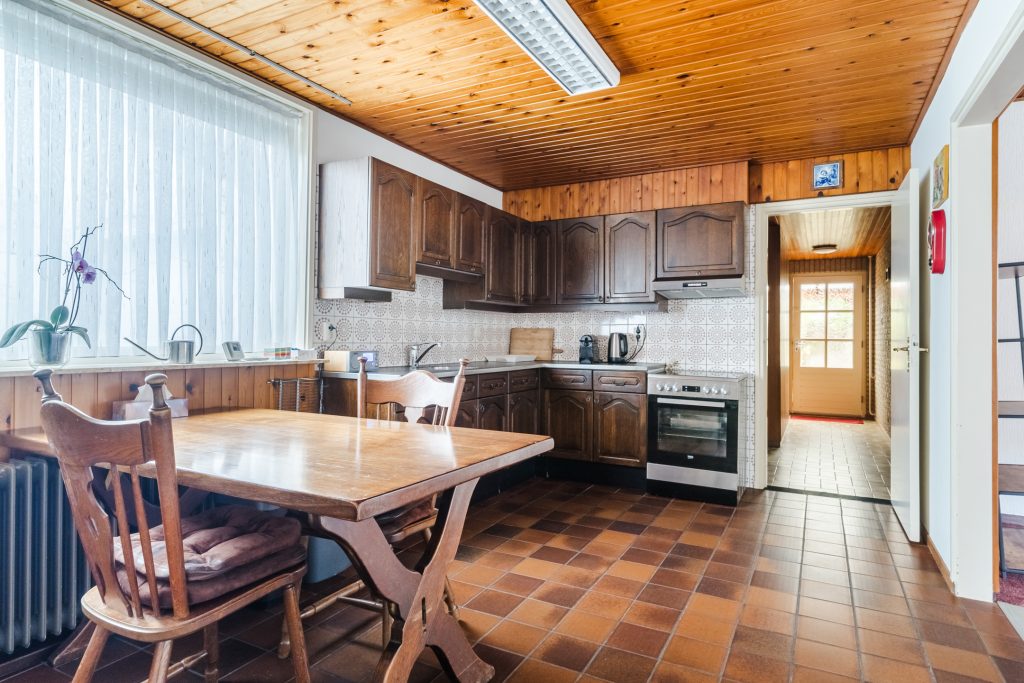 De half-open leefkeuken is uitgevoerd in een praktische hoekopstelling en voorzien van een keramische kookplaat, afzuigkap en oven. In de keuken bevindt tevens zich een handige inbouwkast en toegang tot de volledig betegelde kelder – perfect als provisieruimte of extra bergruimte.