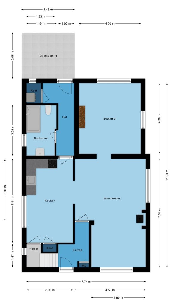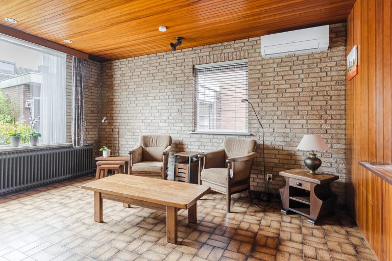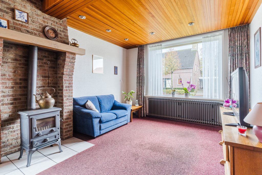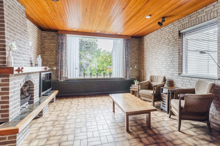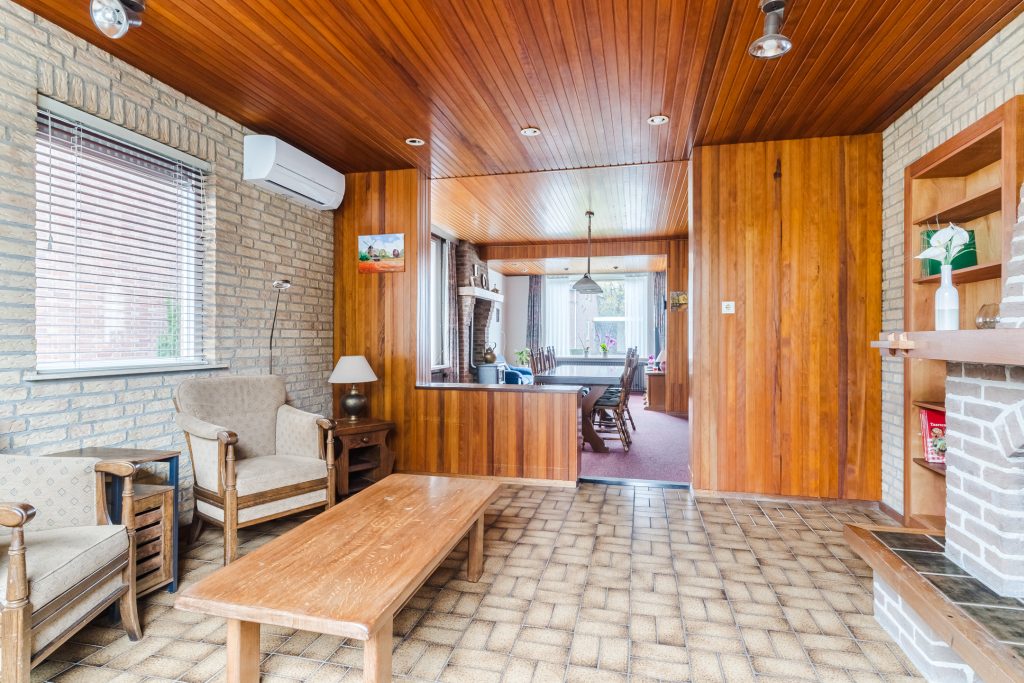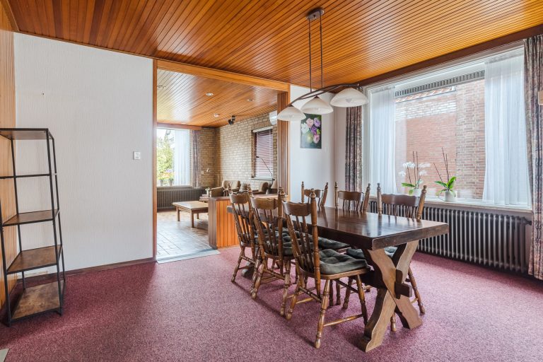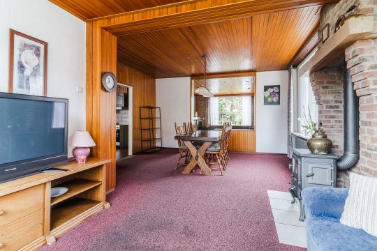 Vanuit de hal stap je de ruime woonkamer binnen, die dankzij de forse uitbouw aan de achterzijde maar liefst 12 meter diep is! Deze royale living biedt volop mogelijkheden voor een gezellige zithoek bij de open haard of de ter overname zijnde houtkachel, én nog meer dan genoeg ruimte voor een grote eettafel of werkhoek. Daarnaast zorgt de in de aanbouw aanwezig airconditioning voor extra comfort.