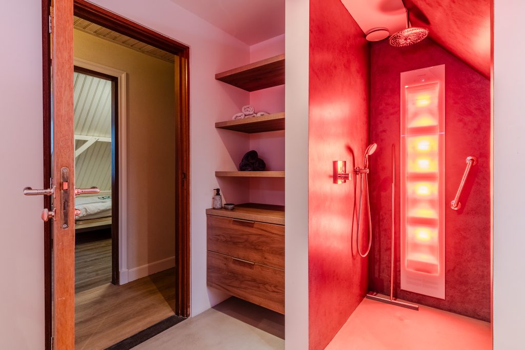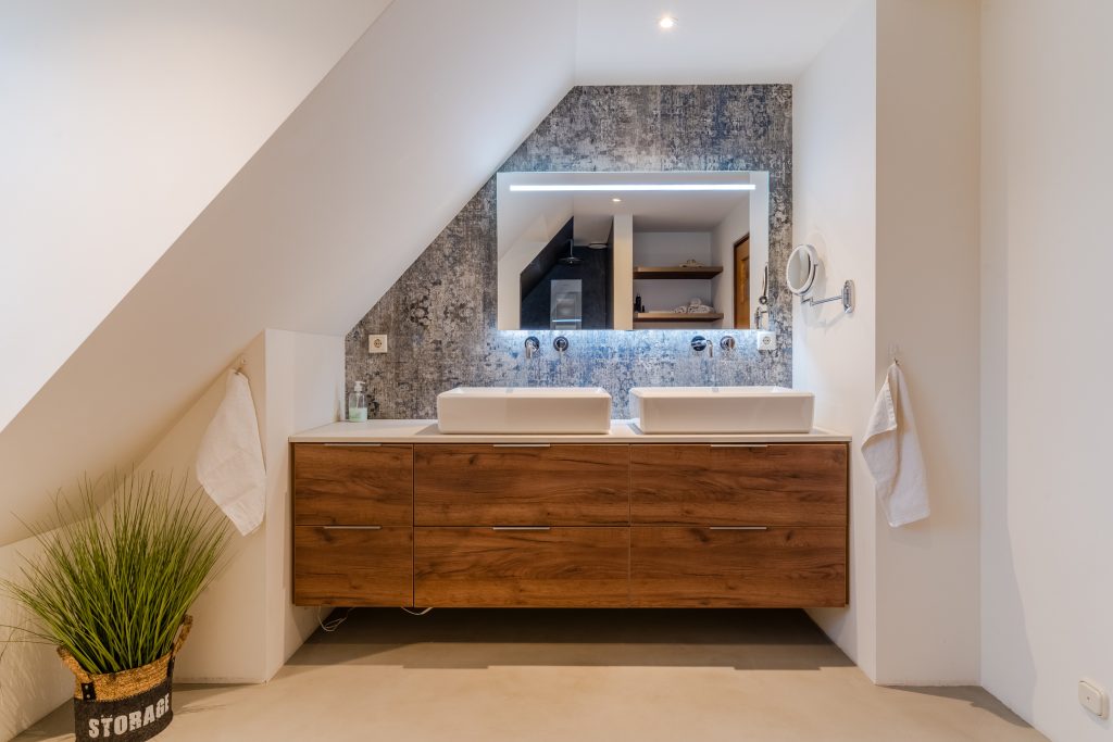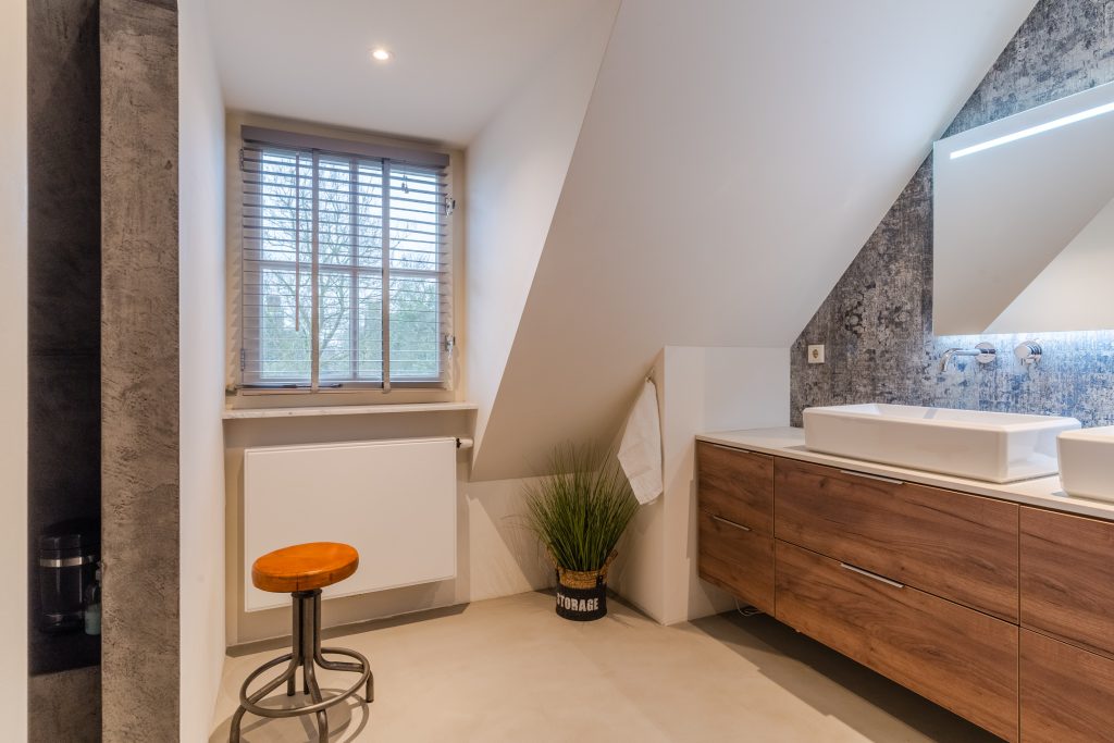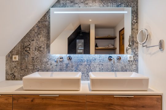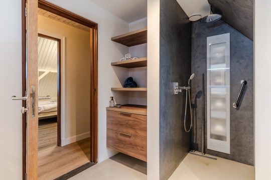 De luxe badkamer, die in 2021 volledig is vernieuwd, voelt als een persoonlijke wellness. De inloopdouche met sunshower, de combinatie van regen- en handdouche, de stijlvolle inbouwkranen en het brede badmeubel met dubbele waskommen creëren een ontspannen en luxueuze sfeer waarin je iedere dag opnieuw tot rust komt. De afwerking is modern, strak en voorzien van subtiele verlichting die de ruimte een serene uitstraling geeft.