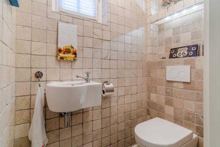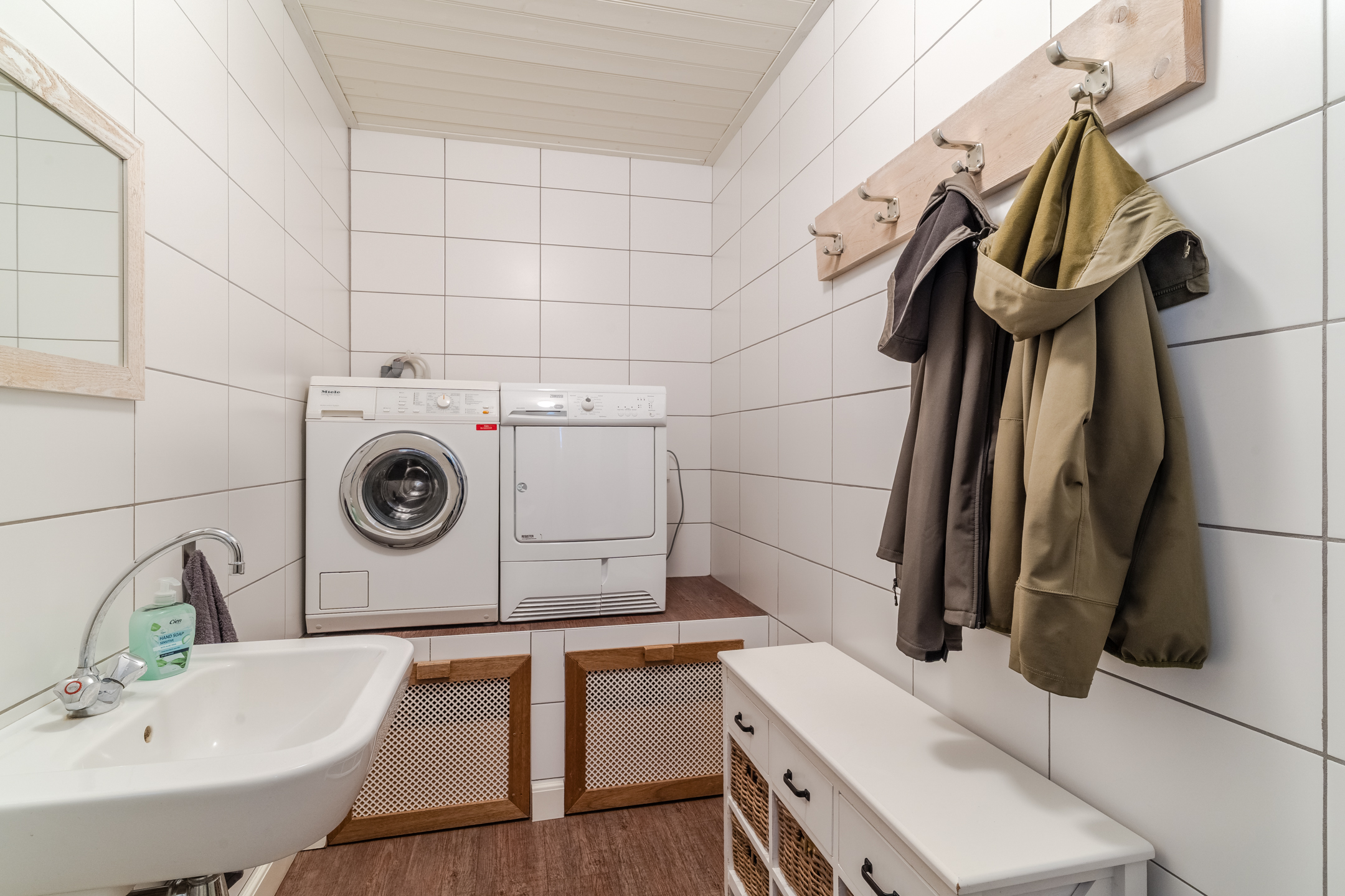 Verder bevindt zich op de begane grond een ruime en volledig betegelde wasruimte met wastafel en aansluitingen op hoogte, wat zorgt voor extra gemak in het dagelijks huishouden.