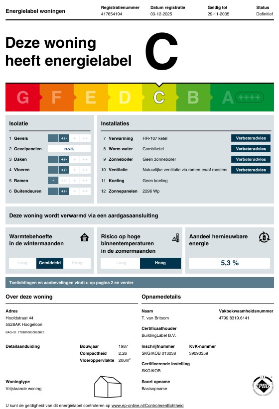 – het woongedeelte is voorzien van dak-, spouwmuur- en vloerisolatie.