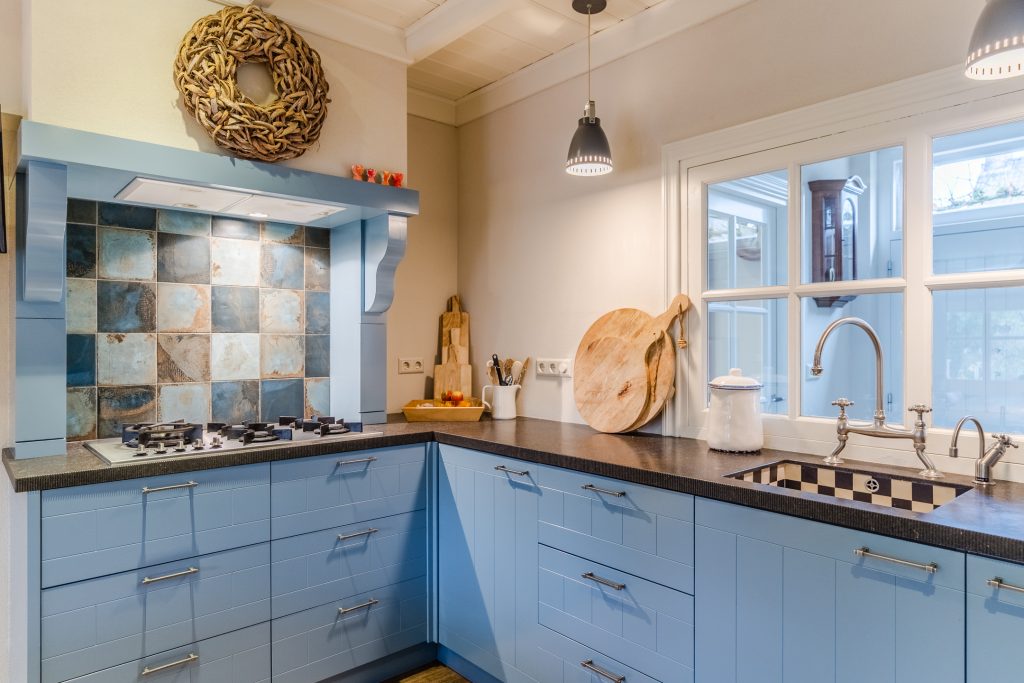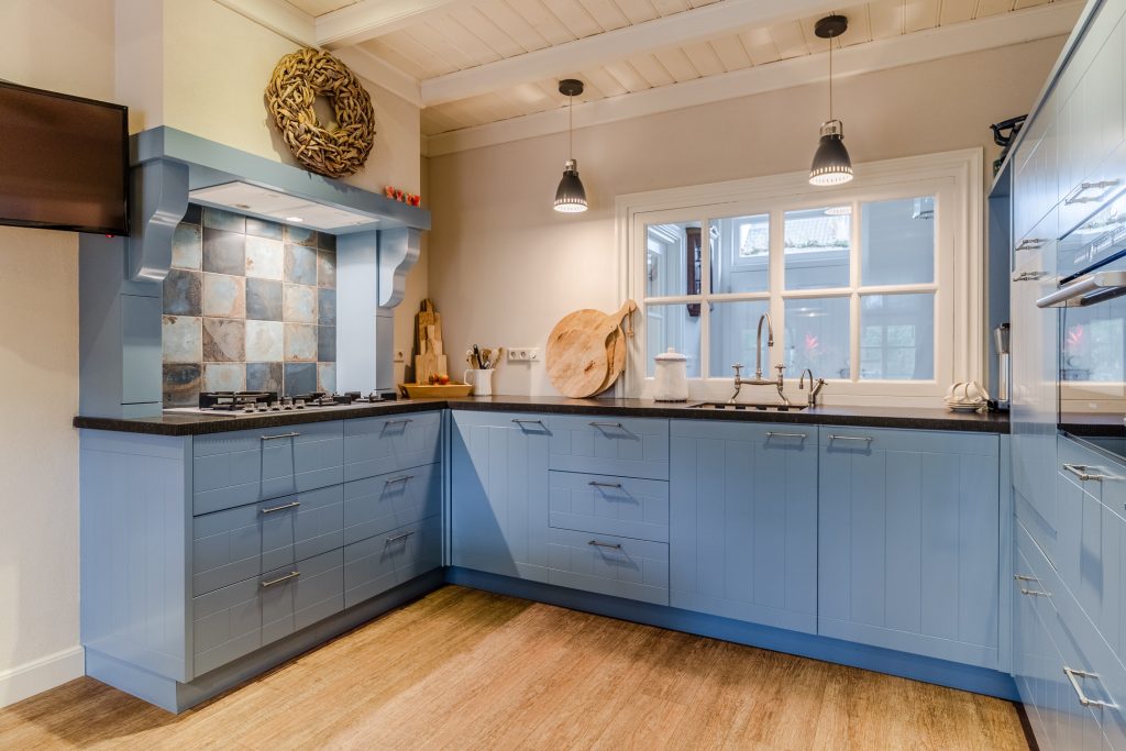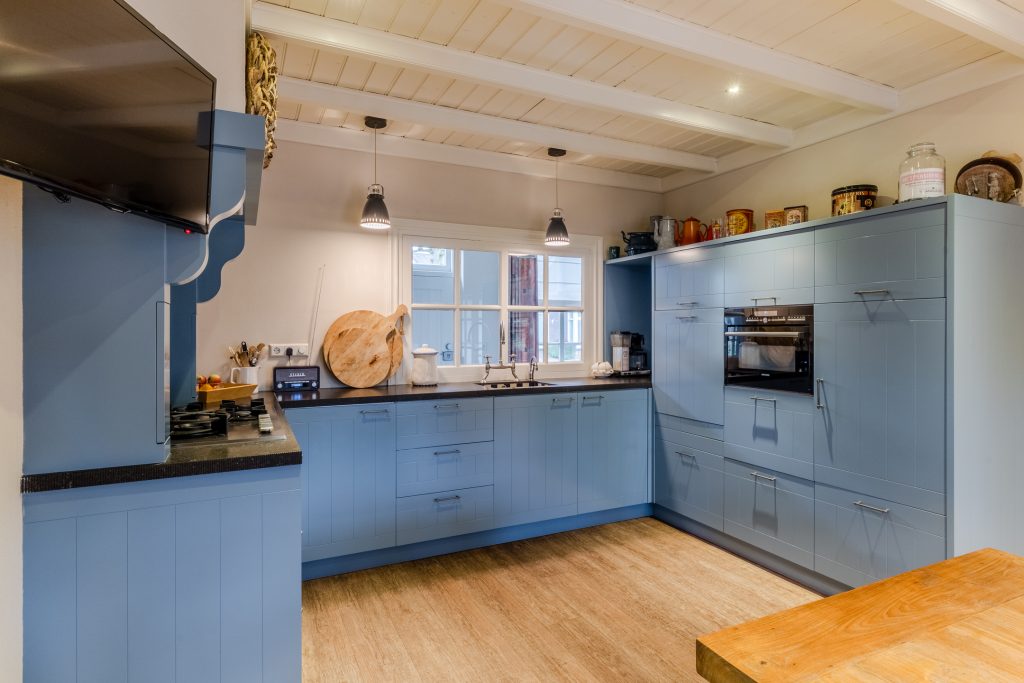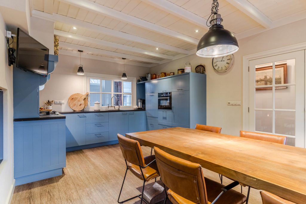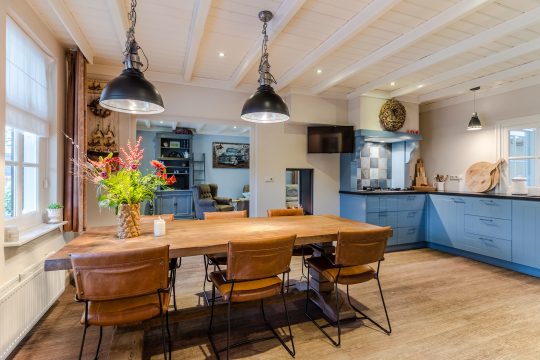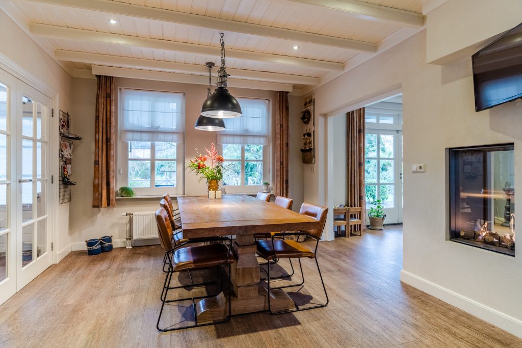 De leefkeuken is een plek waar warmte en gezelligheid samenkomen. De in landelijke stijl uitgevoerde keukenopstelling in U-vorm is niet alleen stijlvol, maar ook bijzonder praktisch en compleet uitgerust met een 5-pits gaskookplaat, afzuigkap, vaatwasser, combi-oven, koelkast, Quooker en robuust hardstenen aanrechtblad. Door de ruimte voor een grote eettafel, het uitzicht op de tuin en de aanwezigheid van de haard ontstaat hier een plek waar het dagelijkse leven zich moeiteloos afspeelt. Of het nu gaat om een uitgebreid diner, een lange zondagochtend met koffie of een gezellige borrel met vrienden, deze leefkeuken voelt altijd gastvrij en comfortabel.