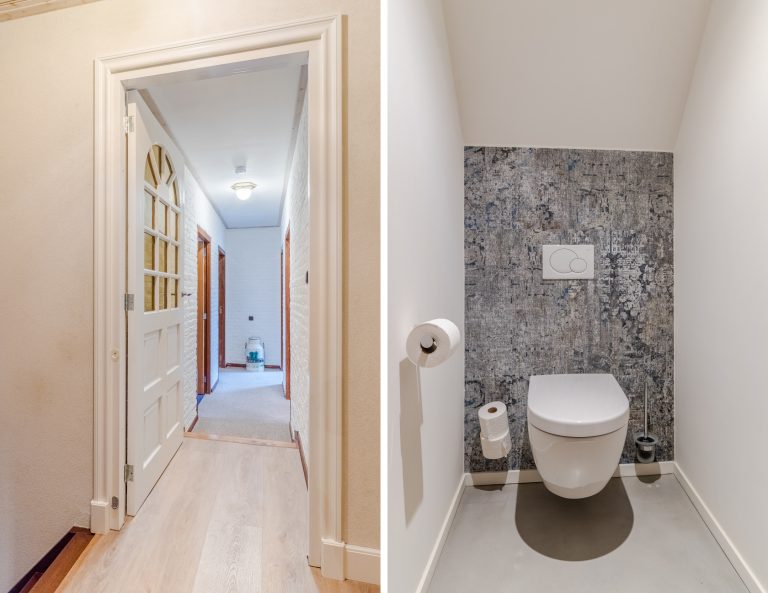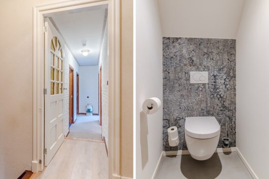 Via de fraaie trap bereik je de eerste verdieping, waar een royale overloop toegang biedt tot meerdere ruimtes waaronder en c.v.-ruimte en een stijlvol uitgevoerde separate toiletruimte.