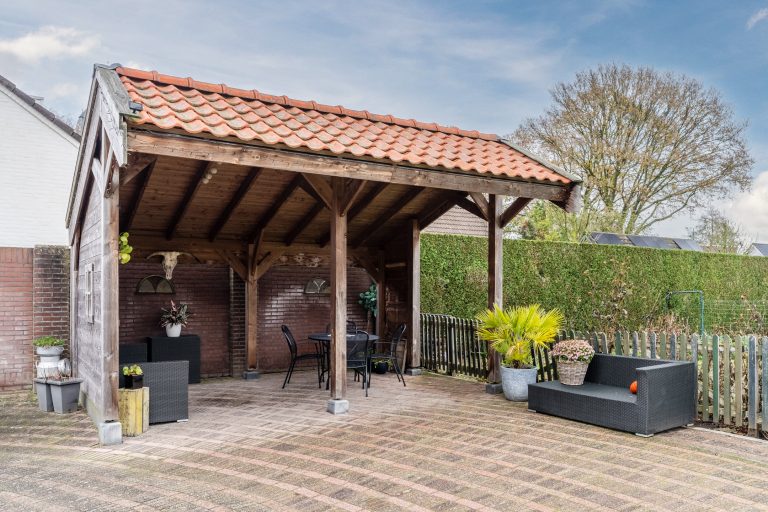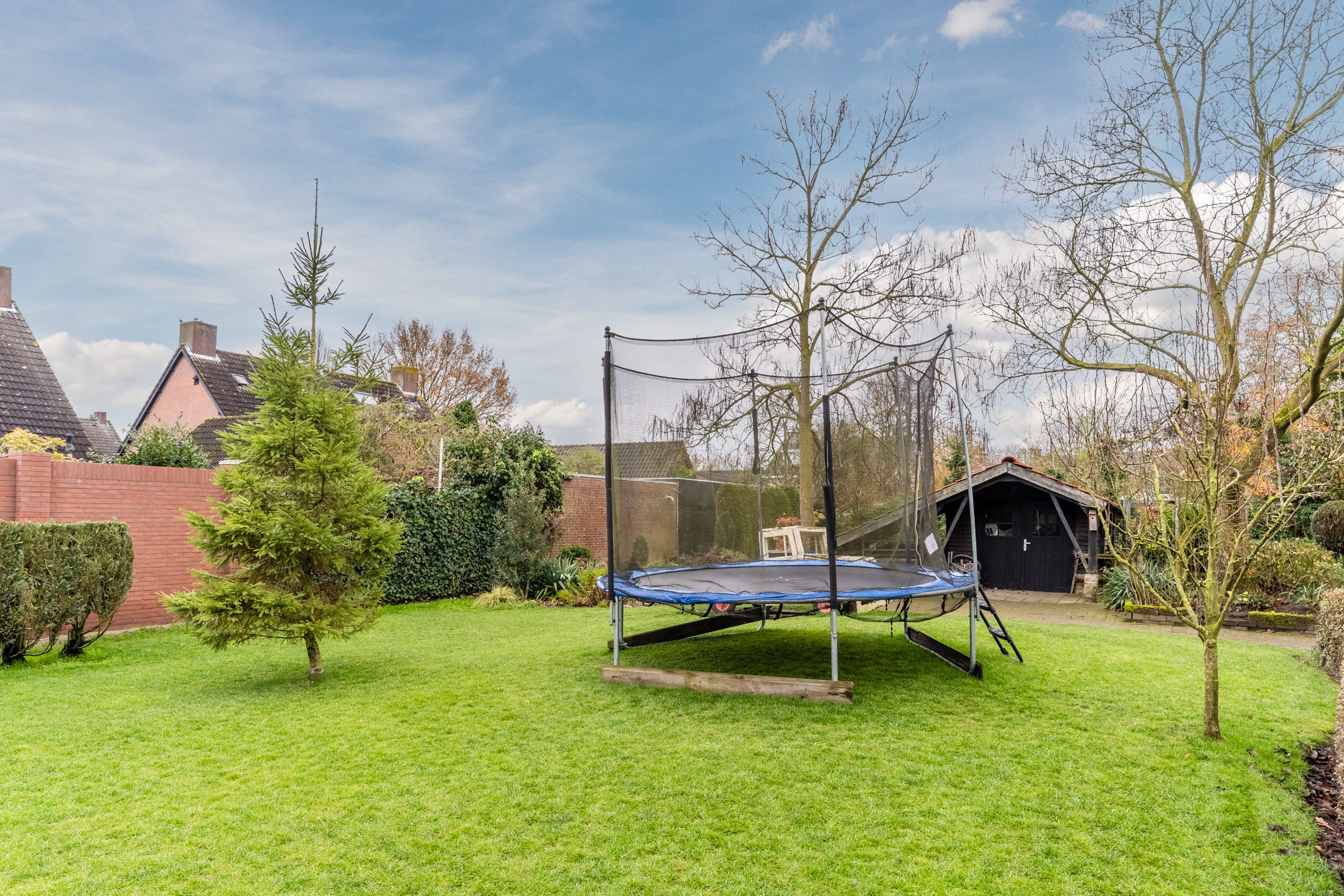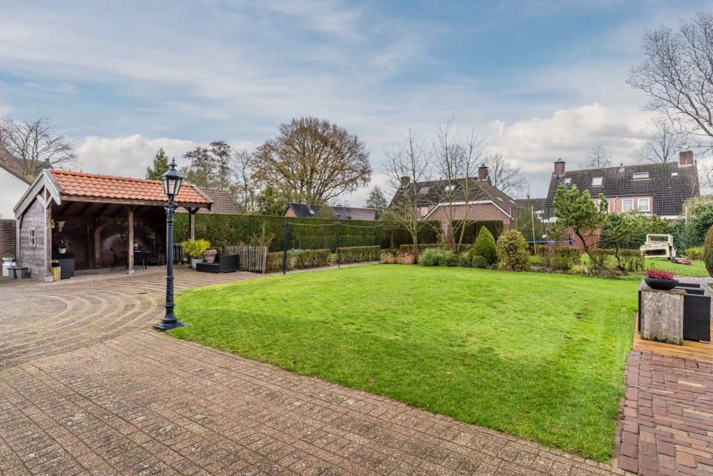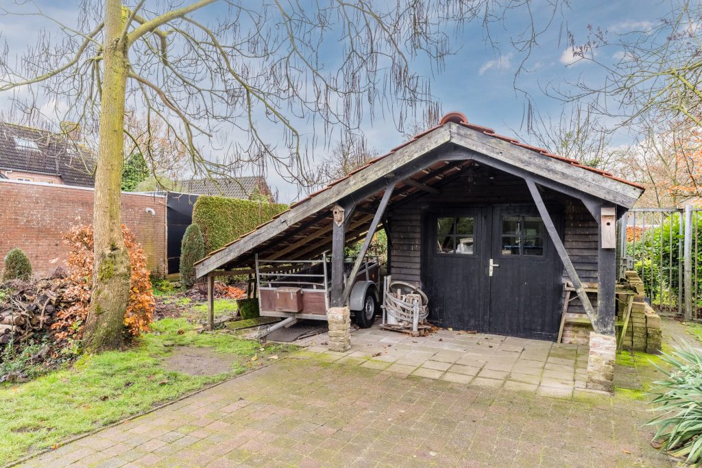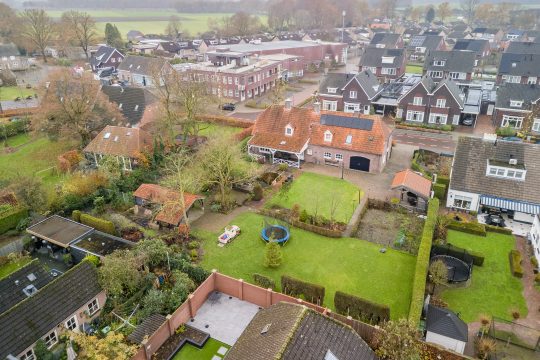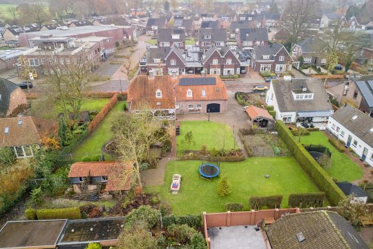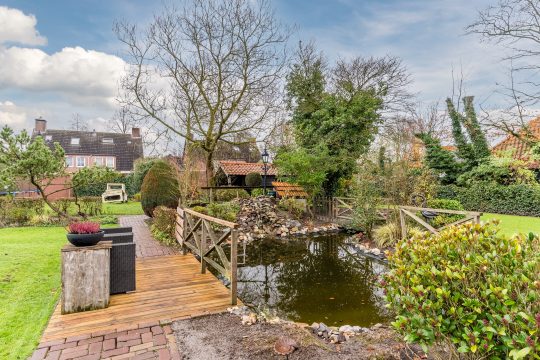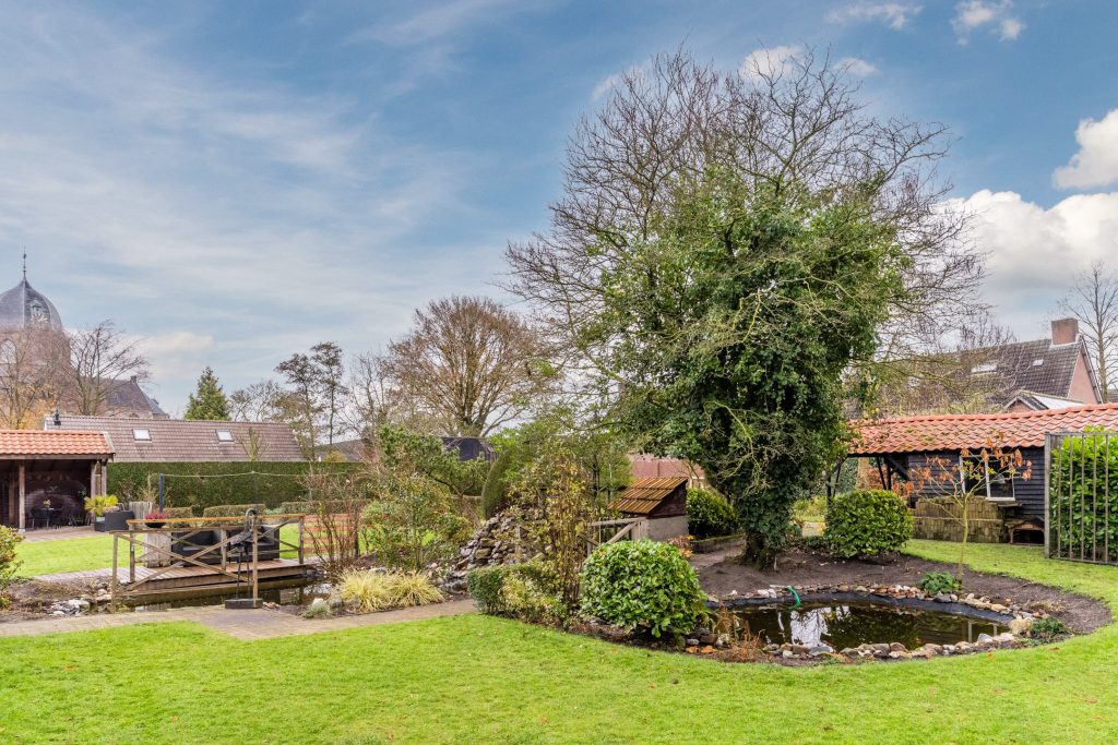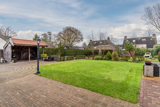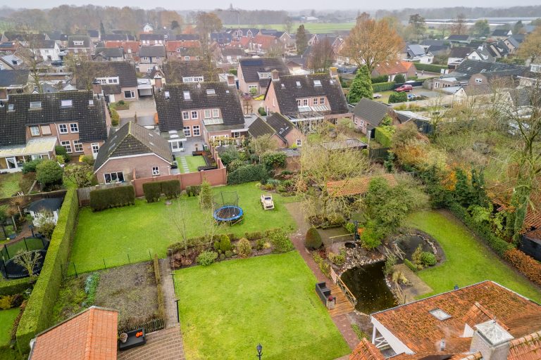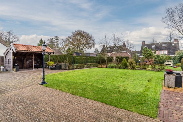 De achtertuin is werkelijk indrukwekkend te noemen. Met een afmeting van ongeveer dertig meter diep en veertig meter breed biedt deze tuin alle mogelijkheden die je maar kunt wensen. Of je nu houdt van zonnen op het terras, ontspannen bij de vijver, werken in de moestuin of spelen op het gazon, alles kan hier. De overkapping aan de achtergevel zorgt ervoor dat je bij ieder weertype van het buitenleven kunt genieten, terwijl de houten tuinberging en de overkapping/carport bij de oprit extra functionaliteit bieden.