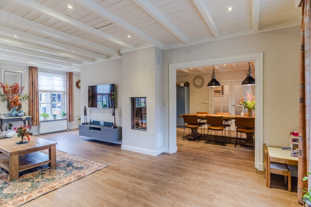 Vanuit de hal loop je door naar de woonkamer, waar de sfeer zich nog sterker laat voelen. De combinatie van het fraaie balkenplafond, de moderne afwerking, de grote raampartijen en de openslaande tuindeuren zorgt voor een heerlijke lichte en warme leefruimte. De doorkijk-gashaard vormt een elegante scheiding tussen woonkamer en leefkeuken en geeft beide ruimtes een bijzondere ambiance.