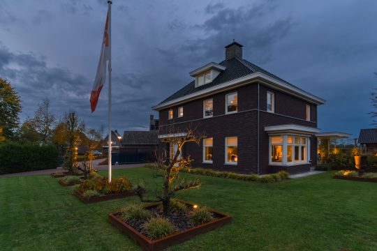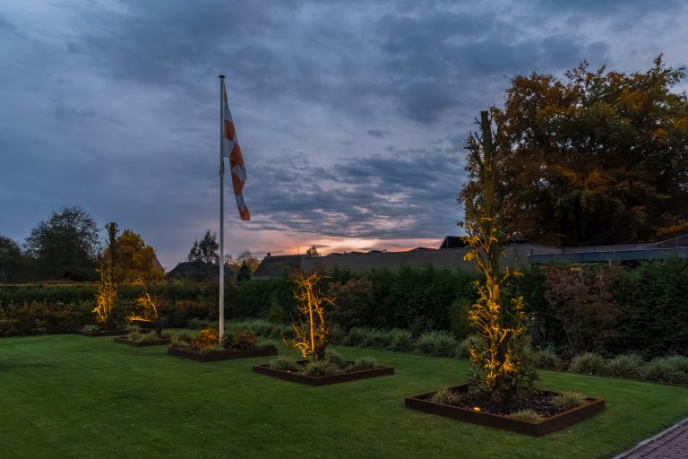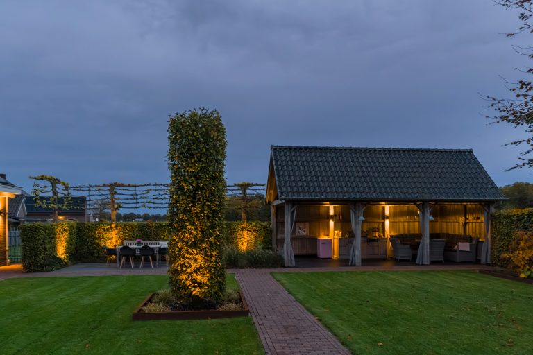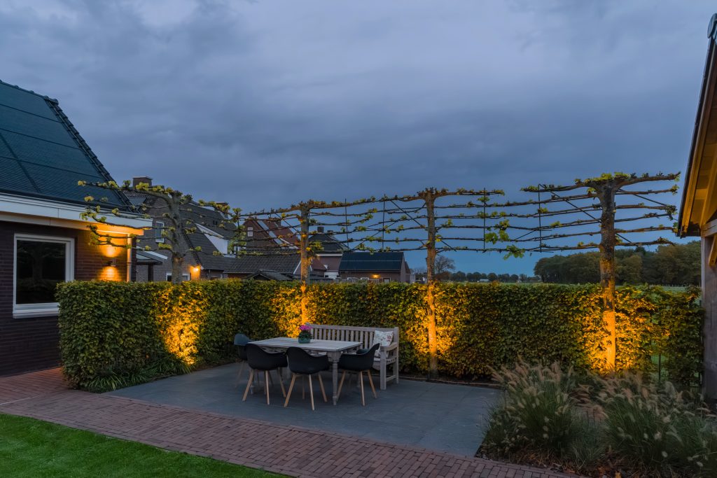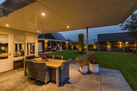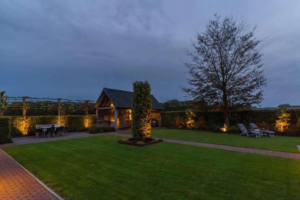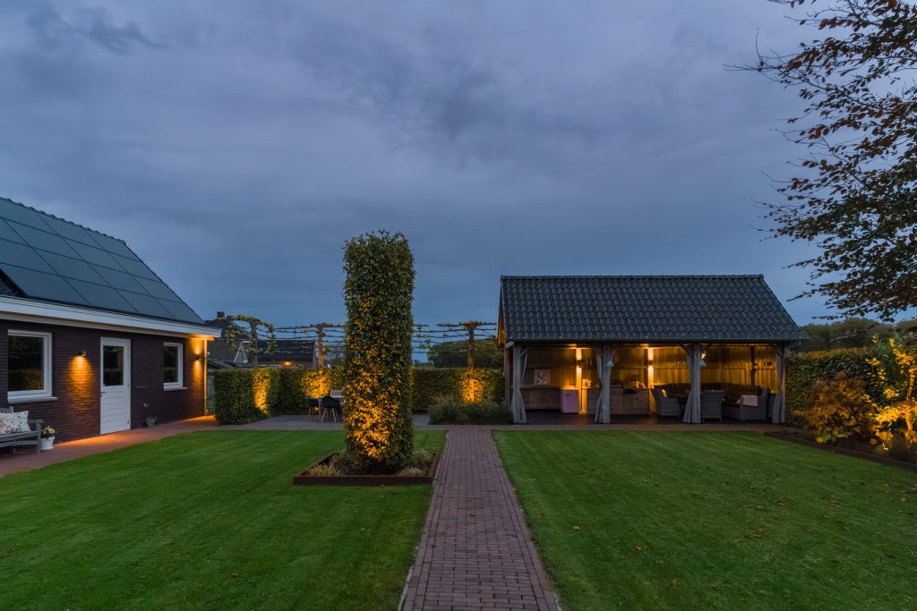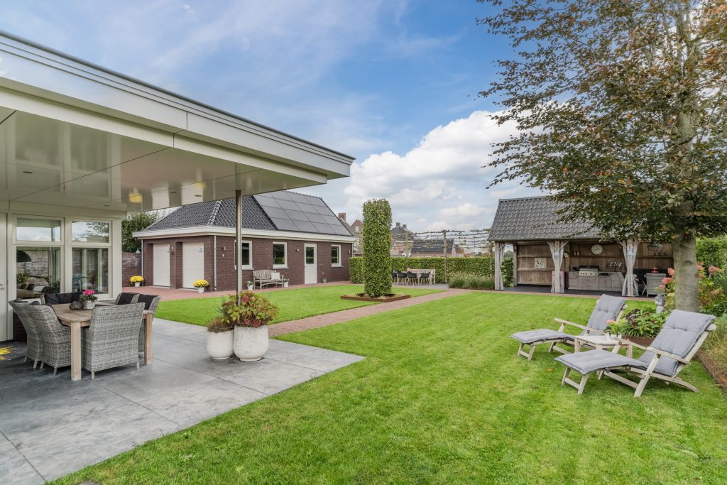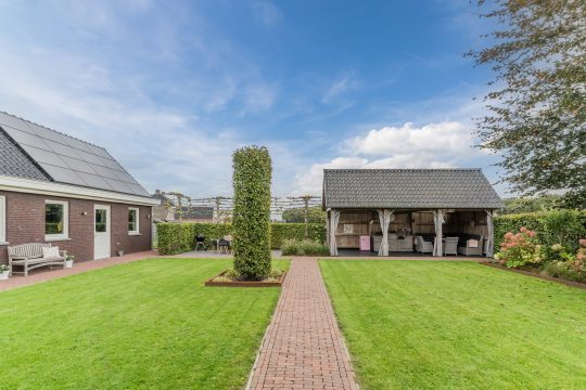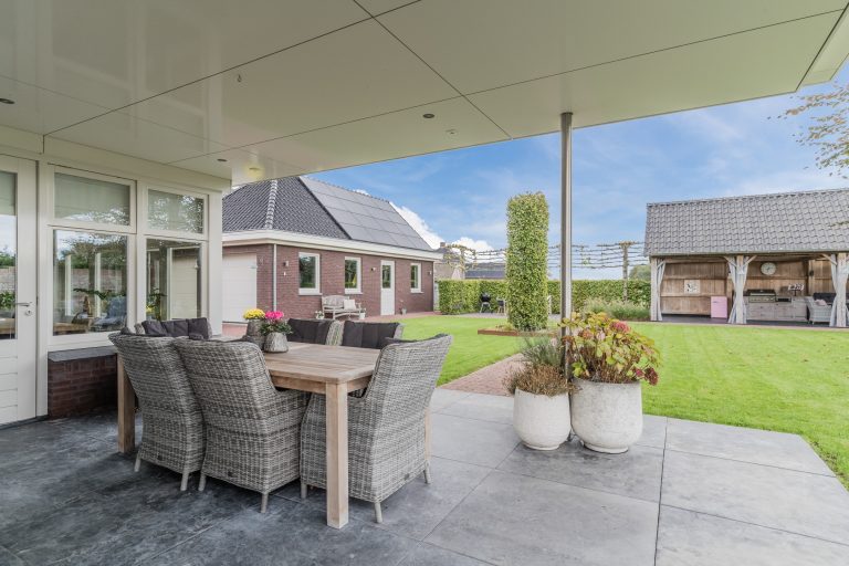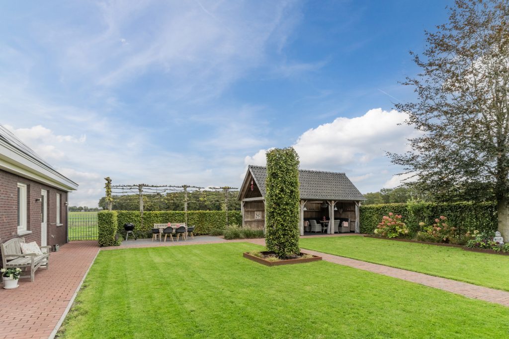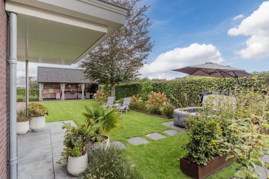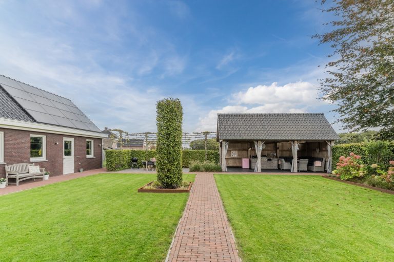 Deze prachtige tuin is in 2023 volledig opnieuw aangelegd. Geniet van rust, privacy en het vrije uitzicht over de velden en bosrand. De ruime tuin heeft een groot gazon, strakke cortenstalen borders met beplanting, twee overkappingen en automatische tuinverlichting. De eiken overkapping aan de achterzijde ligt op het westen – ideaal voor gezellige avonden. De tweede overkapping, grenzend aan de woning, heeft een lichtstraat, inbouwspots en tv-aansluiting. De tuin is volledig omheind en voorzien van een automatische sproei-installatie. De statige vlaggenmast aan de voorzijde maakt het totaal plaatje compleet!
