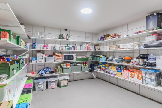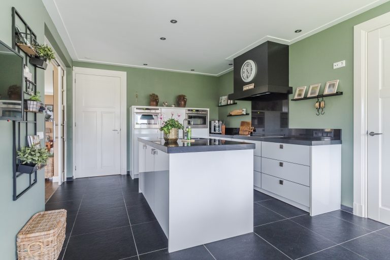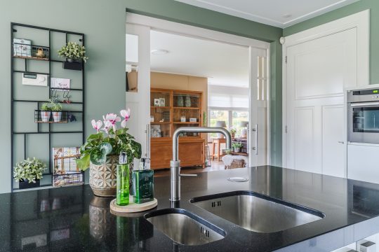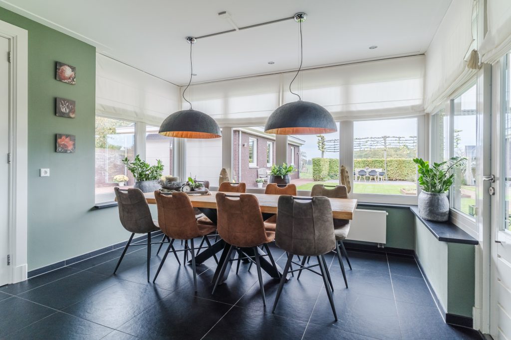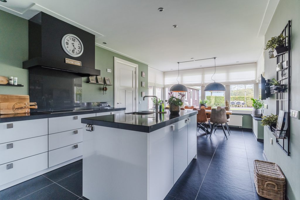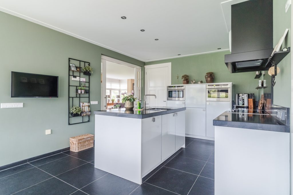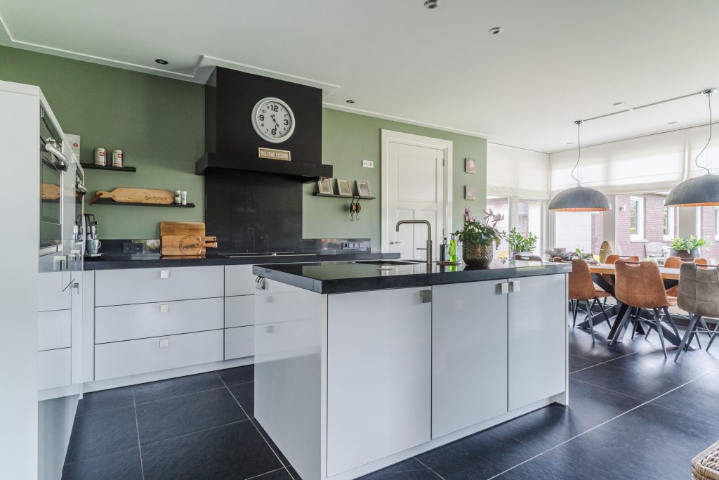 De royale woonkeuken is een van de eyecatchers van het huis. Afgewerkt met een luxe tegelvloer en vloerverwarming, biedt het eetgedeelte een heerlijke plek voor het gezin, met uitzicht op de tuin. De moderne JvD-maatwerkkeuken heeft een hoekopstelling met composieten werkblad, 5-pits inductiekookplaat, afzuigschouw, combimagnetron, oven, koelkast en vele kastruimte. Het kookeiland beschikt over een vaatwasser (Bosch), Quooker, spoelbak en extra opbergruimte. Alle overige apparatuur is van Neff. Onder de keuken bevindt zich een ruime, volledig betegelde kelder (2,20 m hoog) met elektra. Ook vanuit de keuken is er toegang tot de overkapping.