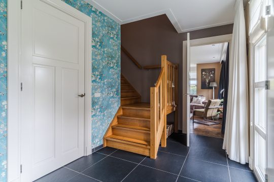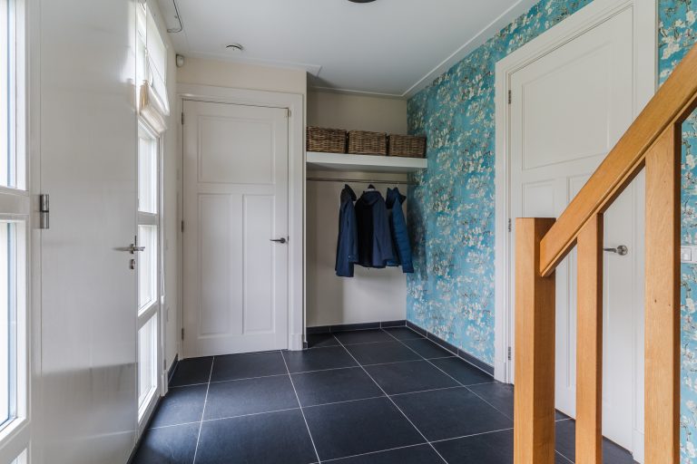 Portaal voorzien van tegelvloer met vloerverwarming, stucwerk wanden en stucwerk plafond met fraaie sierlijsten en inbouwspots. Door middel van een deur heb je toegang tot de achtertuin. In het portaal is tevens een separate, luxe toiletruimte aanwezig welke is voorzien van een hangcloset, urinoir en fonteintje.