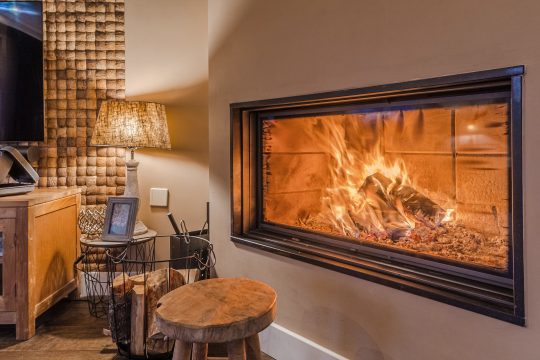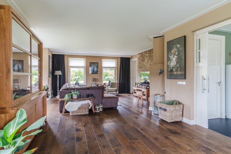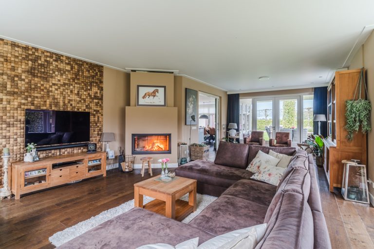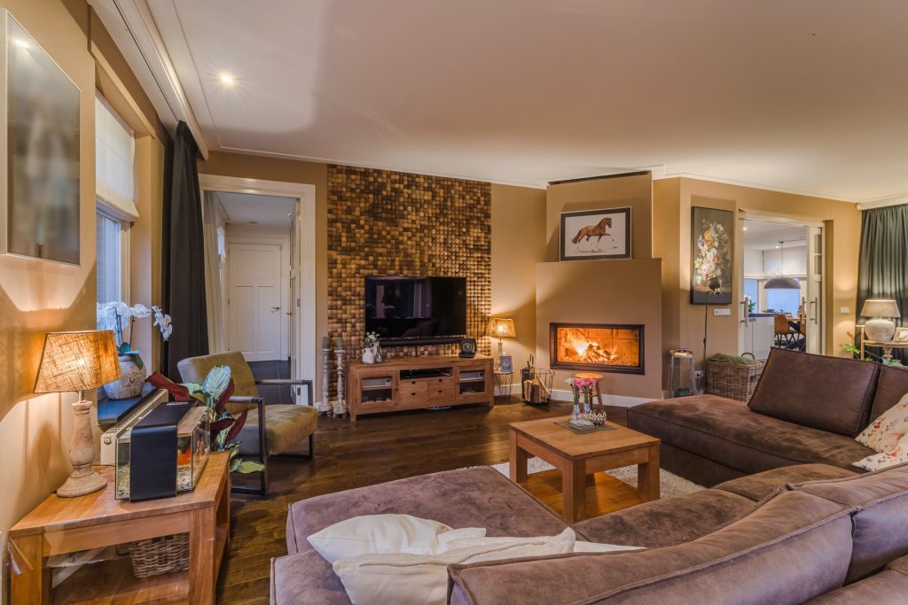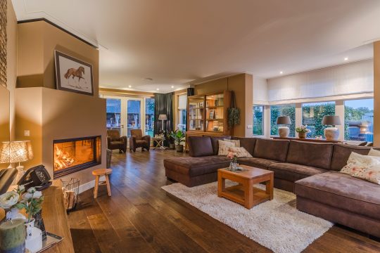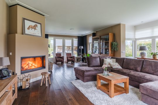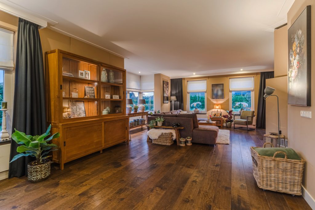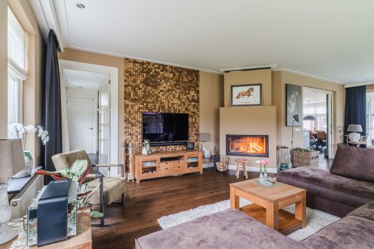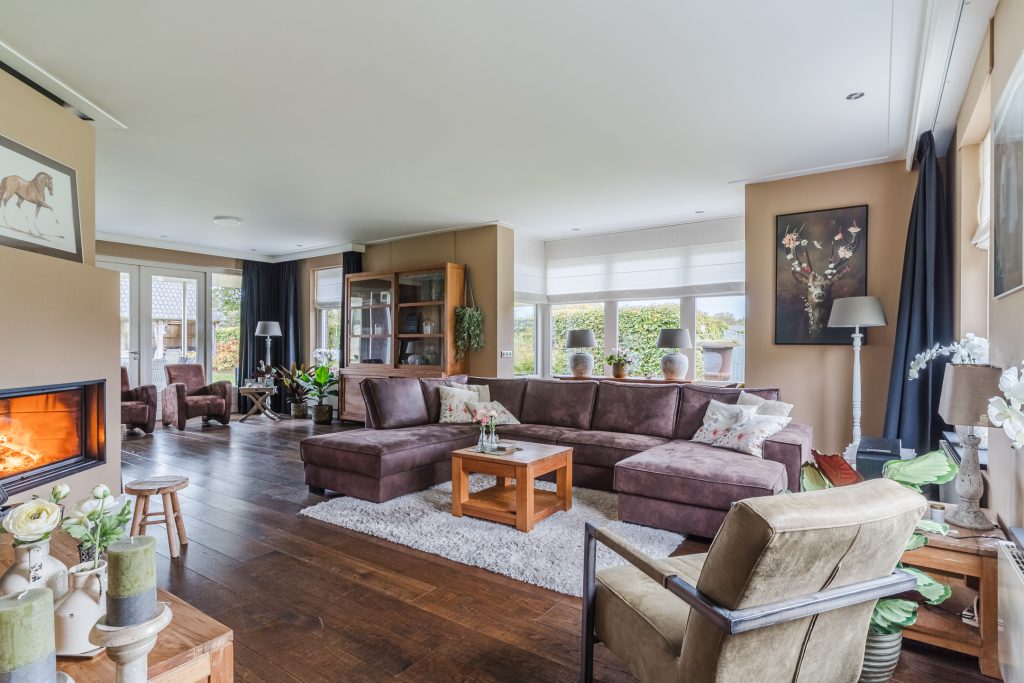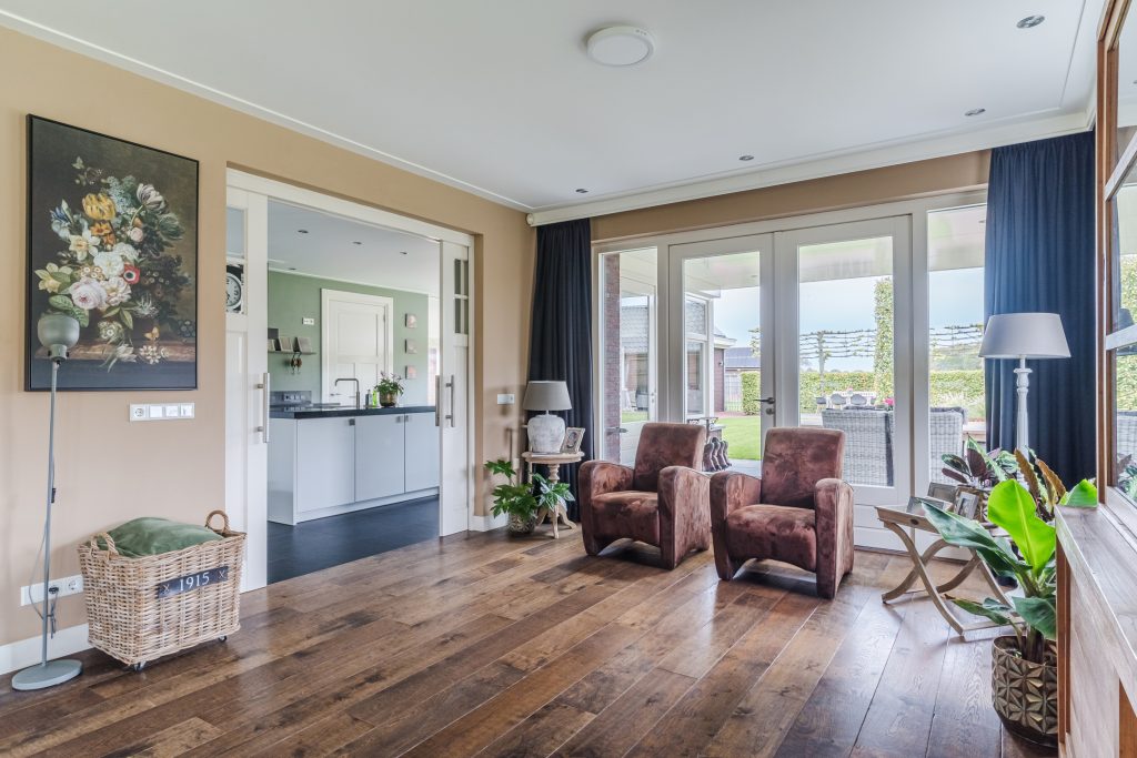 De living is een heerlijke plek om te ontspannen: grote ramen, een stijlvolle erker en een massief houten vloer met vloerverwarming zorgen voor veel licht en warmte. De houtkachel vormt het hart van de ruimte. Via openslaande deuren stap je onder de overkapping met spots, terwijl het uitzicht over de landerijen je elke dag een ander schilderij biedt. De woonkamer staat in directe verbinding met de afsluitbare woonkeuken via stijlvolle ensuite deuren.
