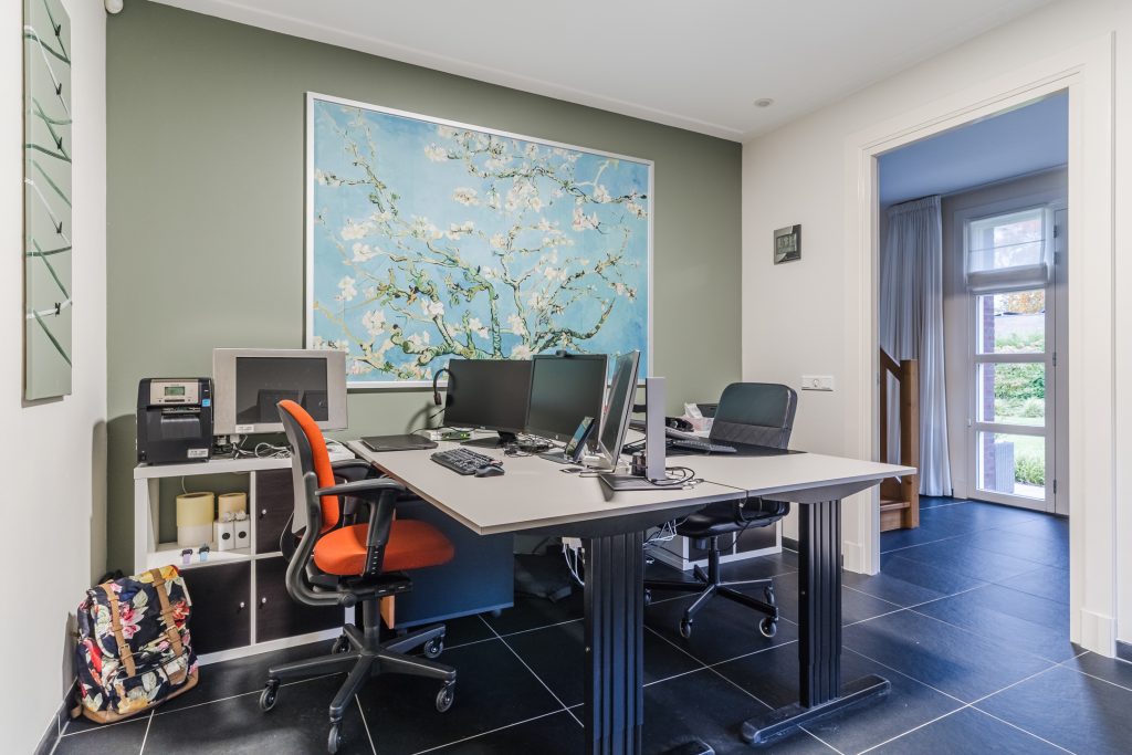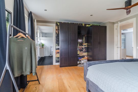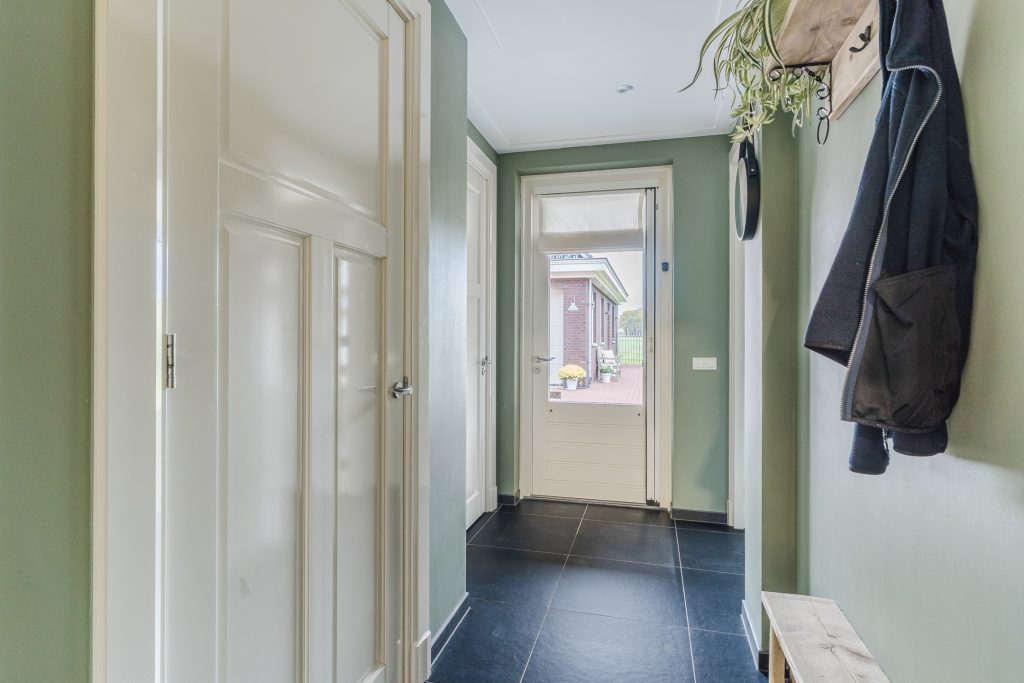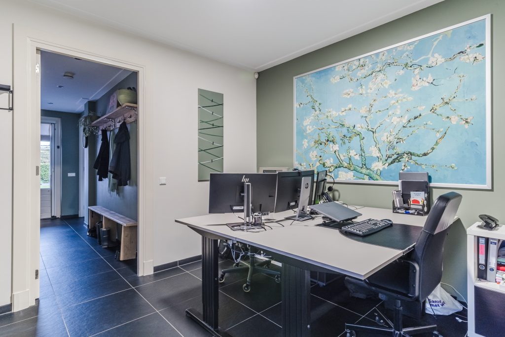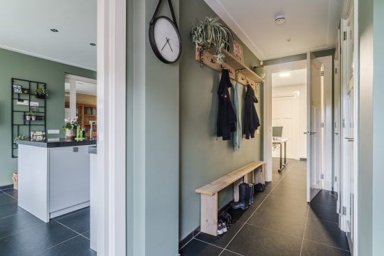 Via de ontvangsthal bereik je de slaapkamer wat het mogelijk maakt om geheel gelijkvloers te wonen. Daarnaast is deze ruimte ideaal te gebruiken als praktijk-, kantoor of hobbyruimte. De ruimte is afgewerkt met een tegelvoer met vloerverwarming, strakke stucwerk wanden en stucwerk plafond met sierlijsten.