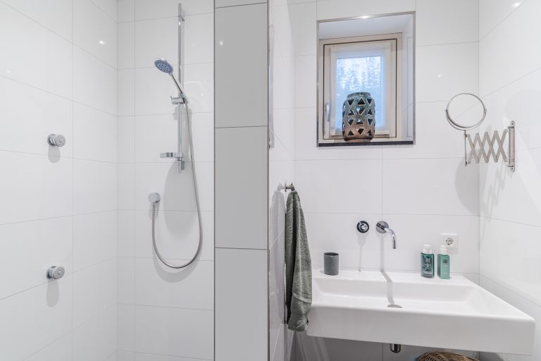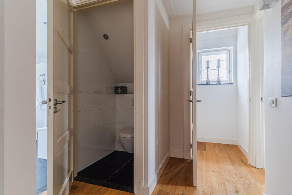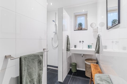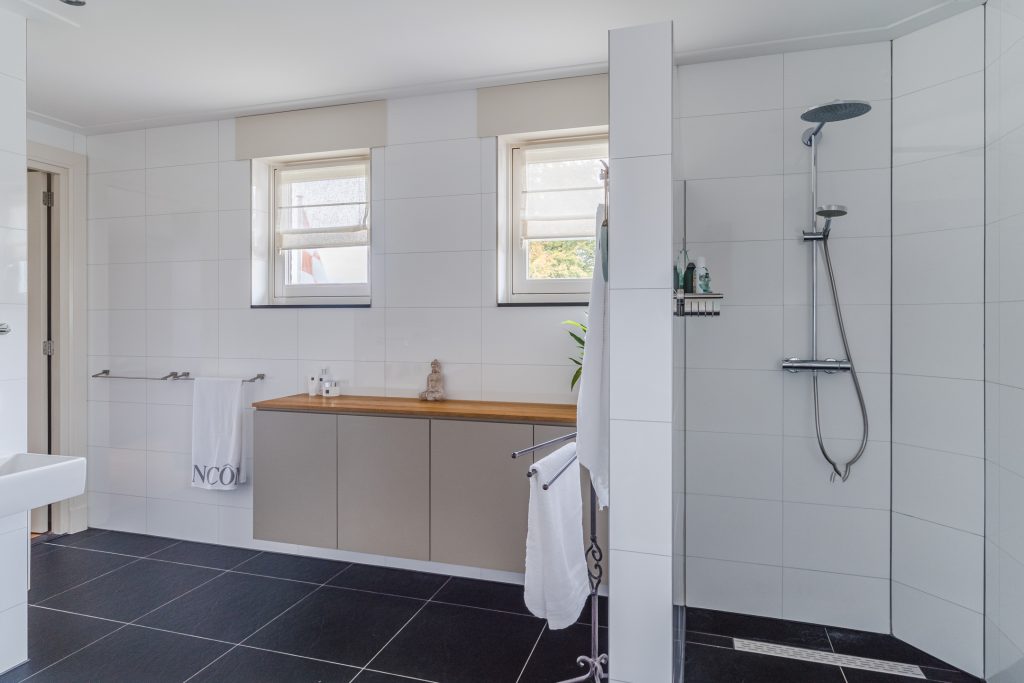 De moderne badkamer is volledig betegeld en uitgerust met een ruime inloopdouche met massagejets, wastafel en vloerverwarming. De geïntegreerde kranen zijn van Hans Grohe.