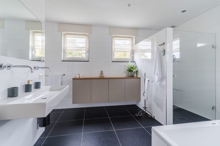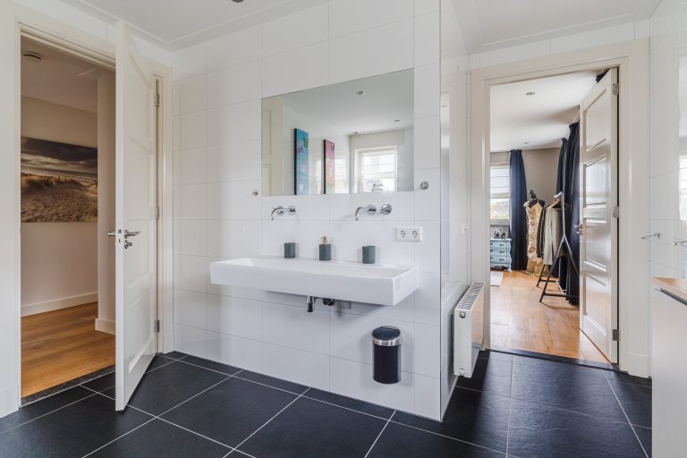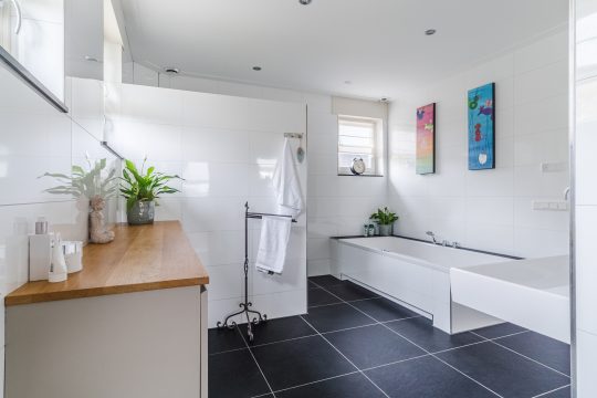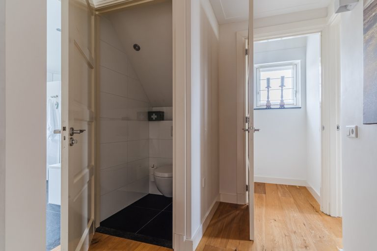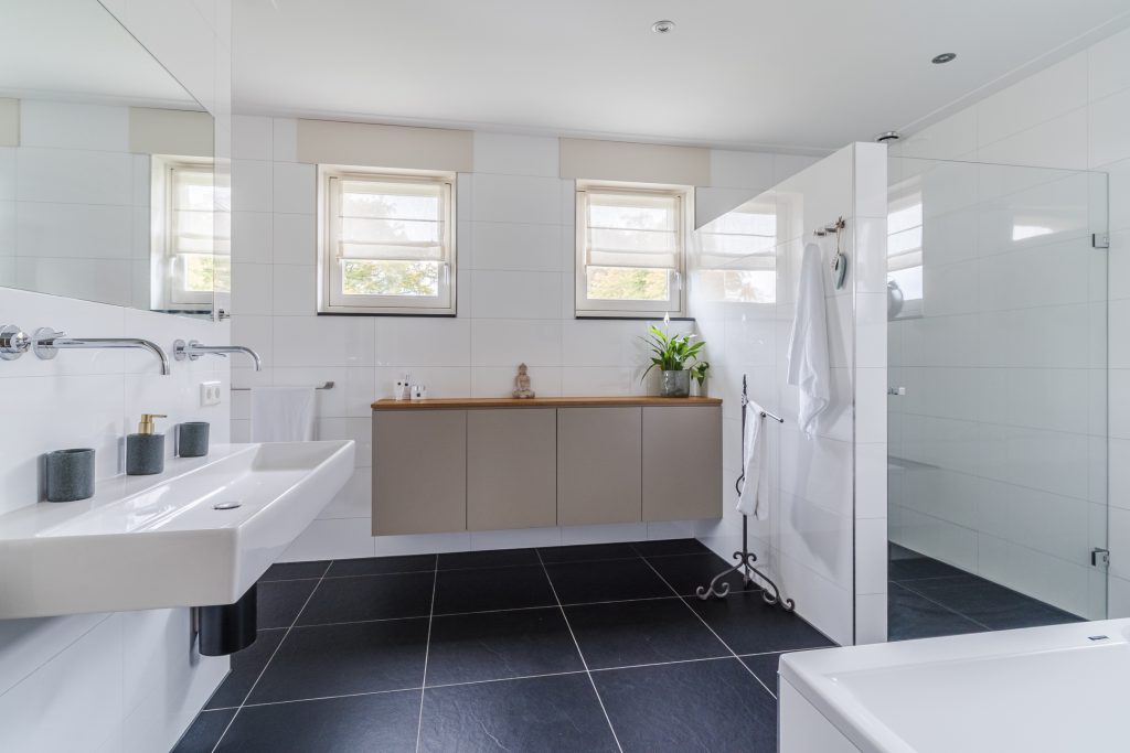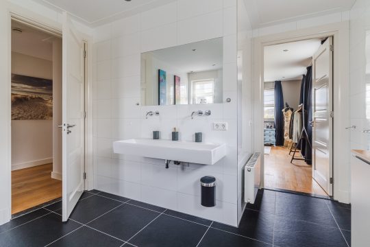 In deze badkamer kom je niets te kort, de kwaliteit en uitstraling passen perfect bij de rest van de woning en door de ruime maat is deze prettig in gebruik. De badkamer is voorzien van een heerlijk ligbad, een grote inloopdouche met regendouche, dubbele wastafel met spiegel, vloerverwarming, designradiator en drie raampartijen. Kastruimte is er voldoende in het separate maatwerk badmeubel. Door het ingebouwde radiosysteem kun je gedurende het badderen heerlijk genieten van jouw favoriete muziek. Alle kranen zijn van het kwaliteitsmerk Hans Grohe.