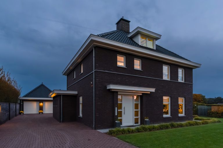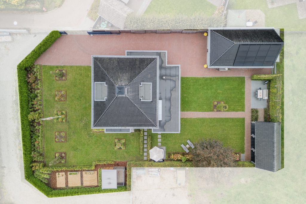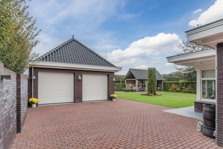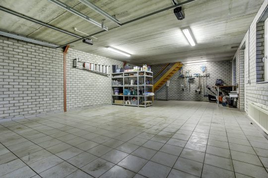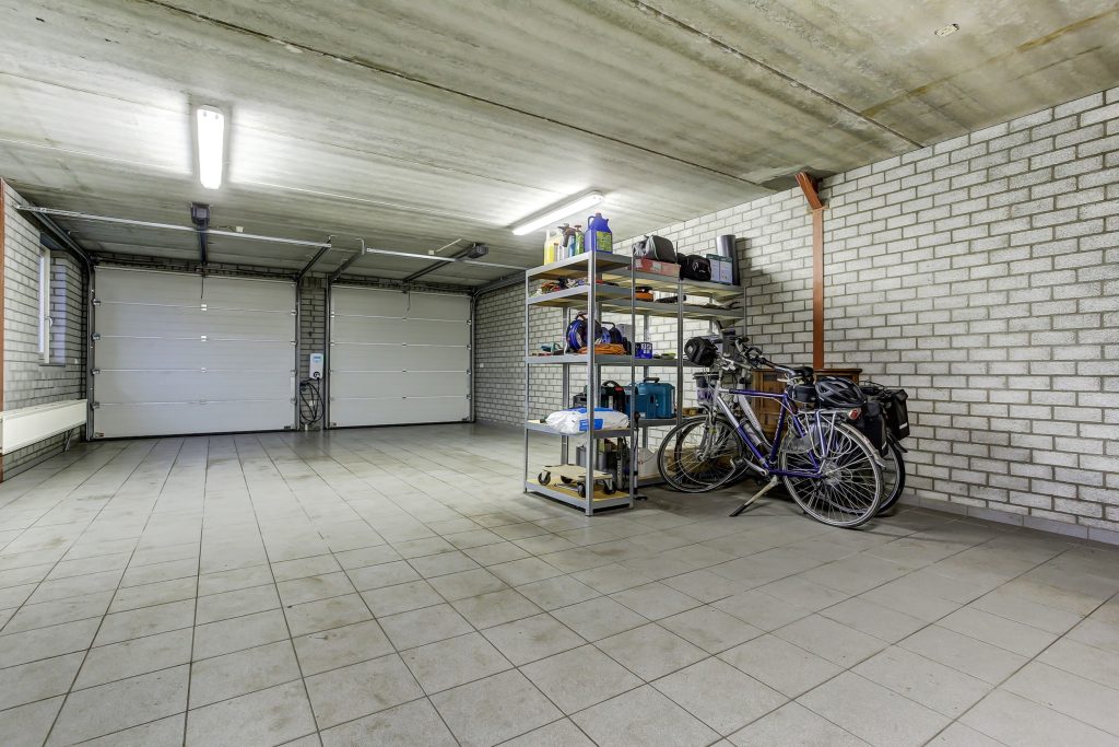 De dubbele garage (89 m²) is volledig geïsoleerd en uitgerust met verwarming, elektrische laadpaal, twee elektrische roldeuren, uitstortgootsteen, aansluiting voor wasapparatuur en vaste trap naar de zolder. De ruimte kan eventueel worden omgebouwd tot kantoor of mantelzorgwoning.