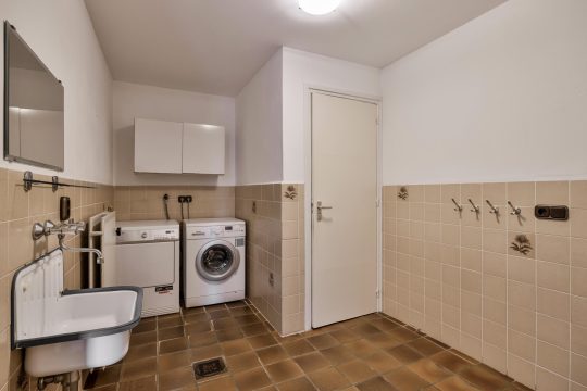 Gedeeltelijk betegelde bijkeuken met wasmachine-aansluiting, uitstortgootsteen en een volledig betegeld toilet met fonteintje.