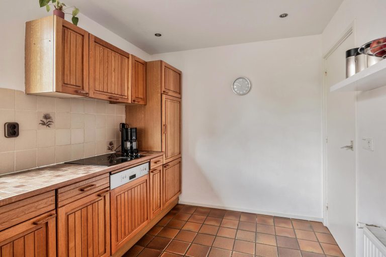 Dichte keuken met een tegelvloer en een keukeninrichting in hoekopstelling voorzien van een keramische kookplaat, afzuigkap, koelkast en vaatwasser.