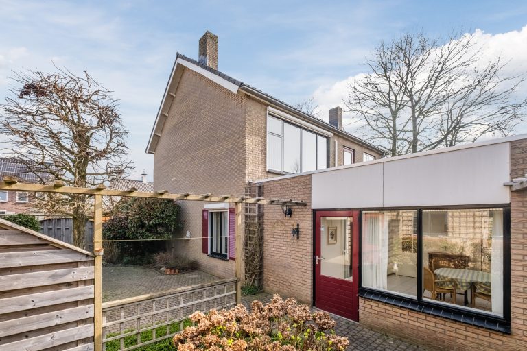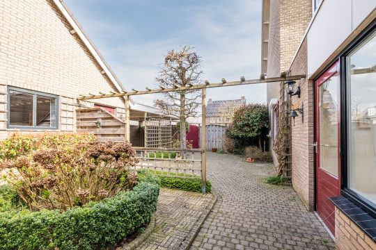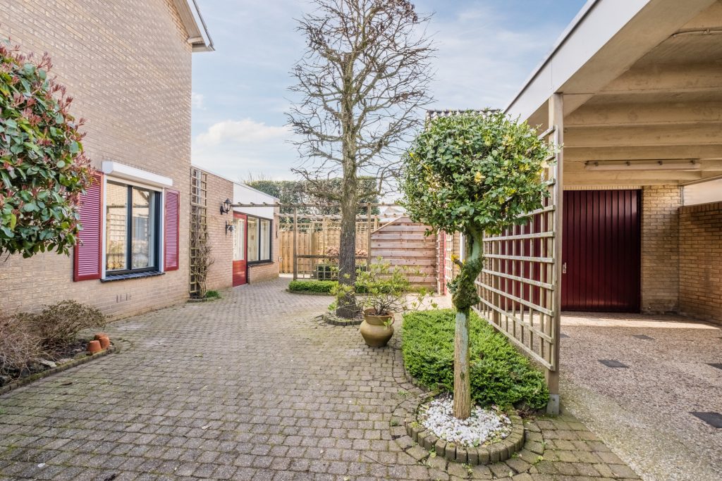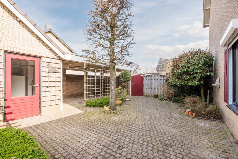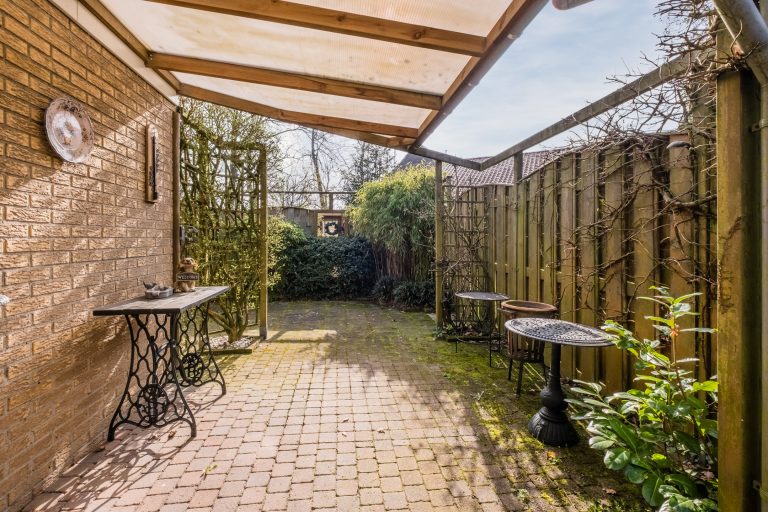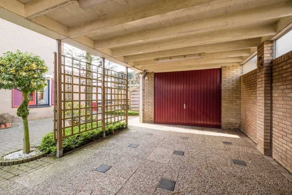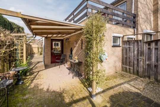 De achtertuin is vrij gelegen en grenst aan groen, wat zorgt voor rust en privacy. De tuin is voorzien van bestrating, vaste beplanting en een overdekt terras waar je beschut kunt zitten. Vanuit de tuin heb je toegang tot de garage met carport en een riante oprit.