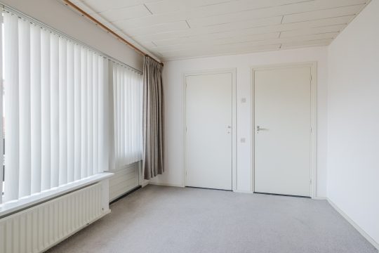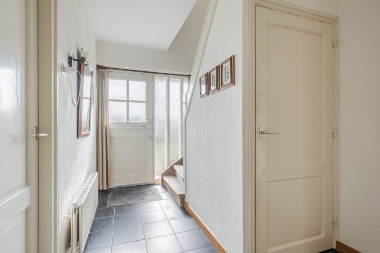 Via de voortuin met vaste beplanting en druppelslangen bereik je de entree. In de hal vind je de garderobe, de verdiepte kelderkast en de meterkast. Aan de voorzijde ligt een extra kamer die ideaal is als kantoor of speelkamer. Deze ruimte beschikt over vaste kasten en is afgewerkt met tapijt.