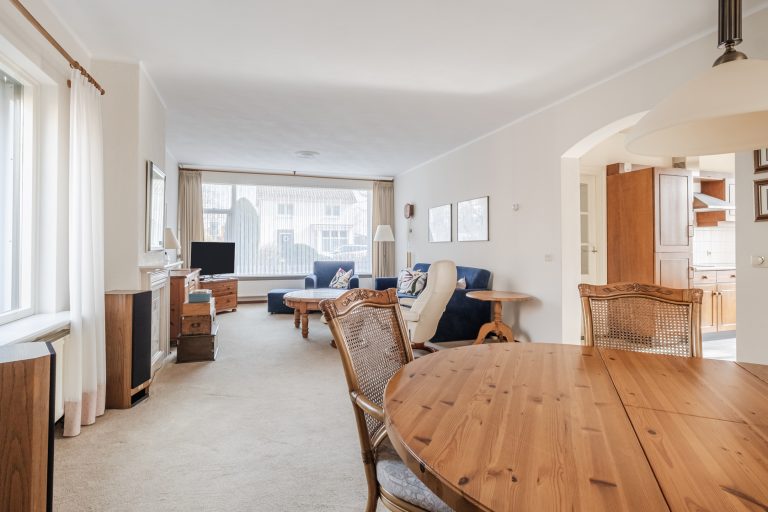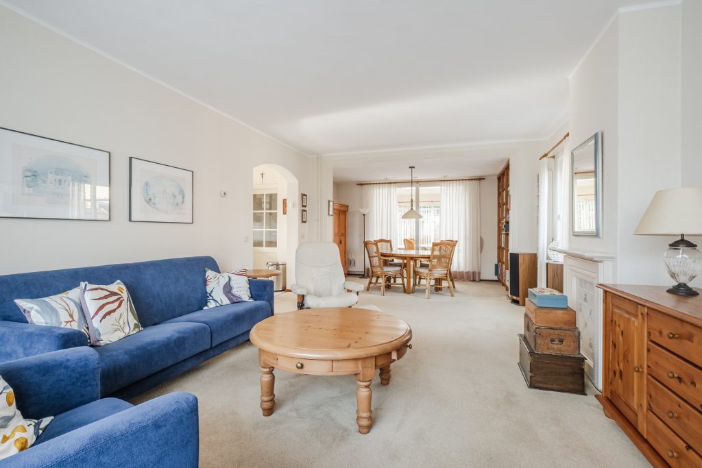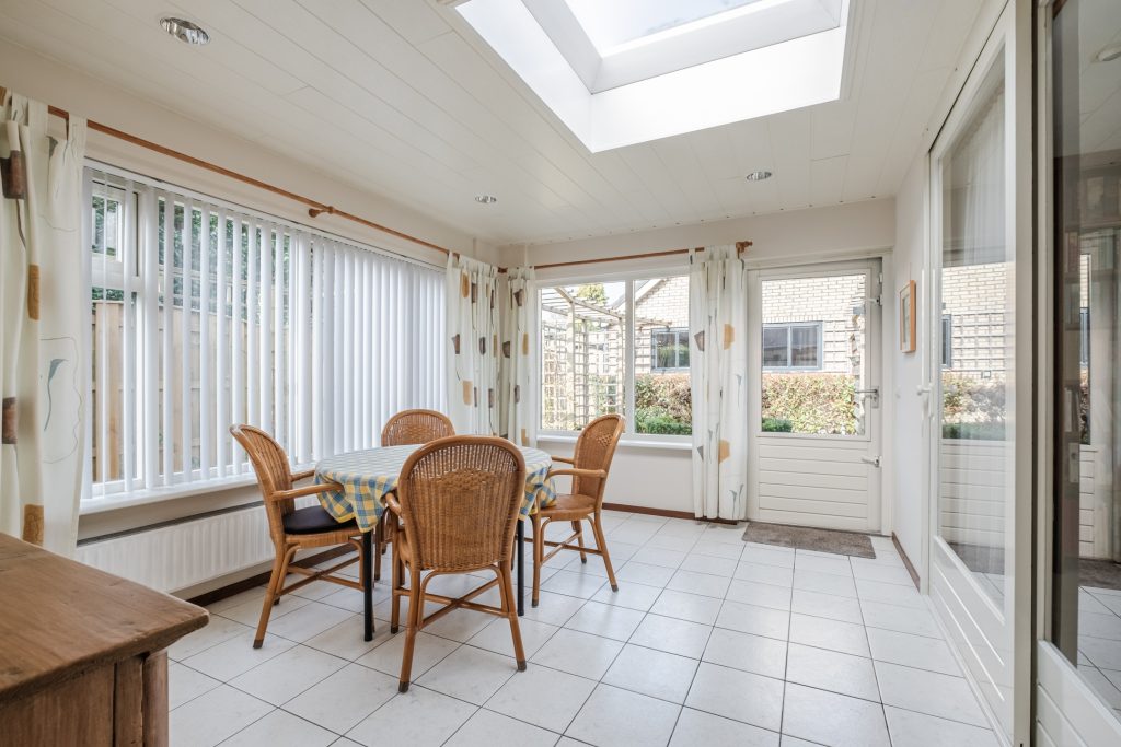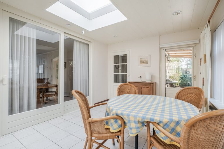 De woonkamer is verrassend ruim en licht. Dankzij het zijraam en de grote schuifpui aan de achterzijde valt veel daglicht binnen. In de zithoek aan de voorzijde is glasvezel aanwezig en het zijraam is voorzien van een rolluik. De schuifpui geeft toegang tot de serre of speelkamer, die weer direct in verbinding staat met de tuin.