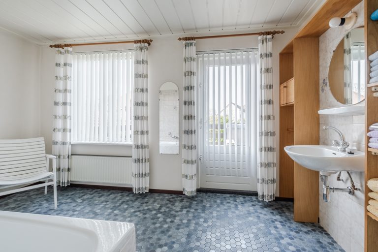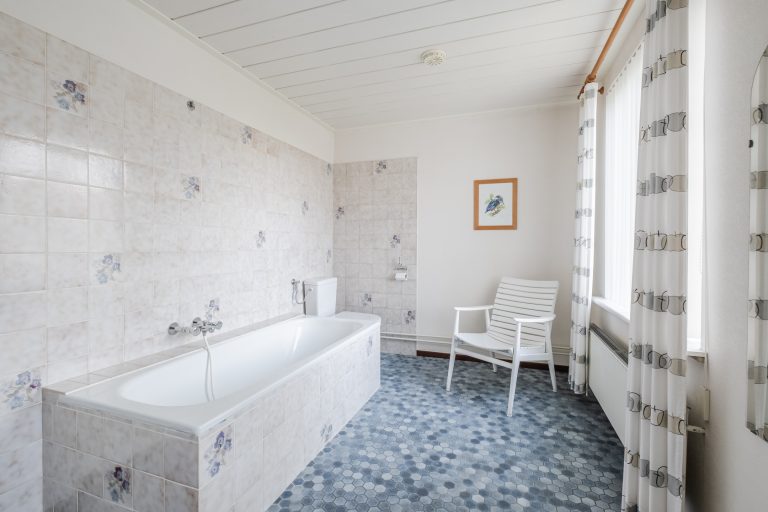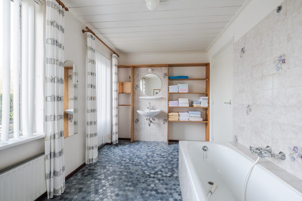 De badkamer is deels betegeld en ruim opgezet. Hier vind je een ligbad, closet en wastafel. Vanuit de badkamer heb je toegang tot het dakterras.